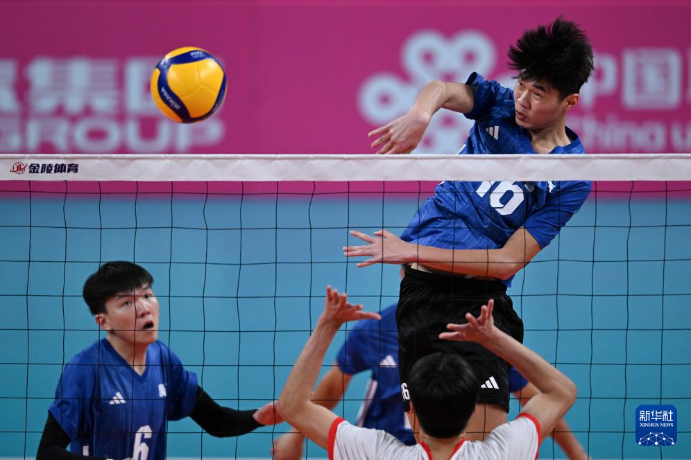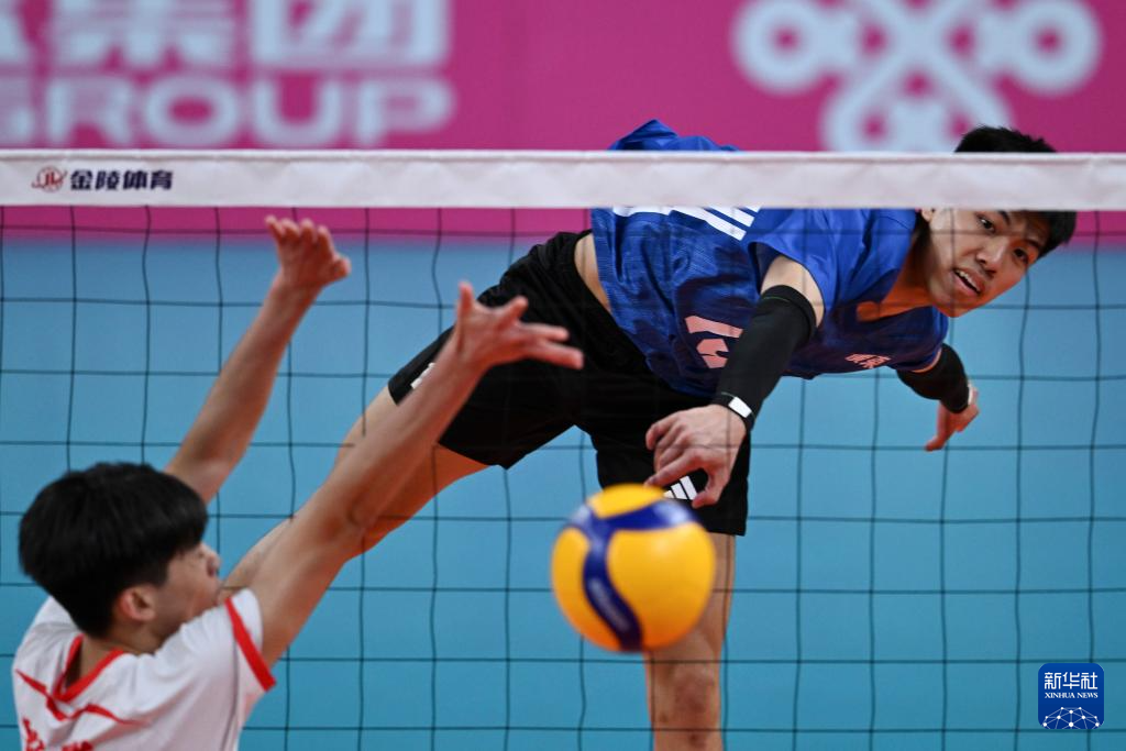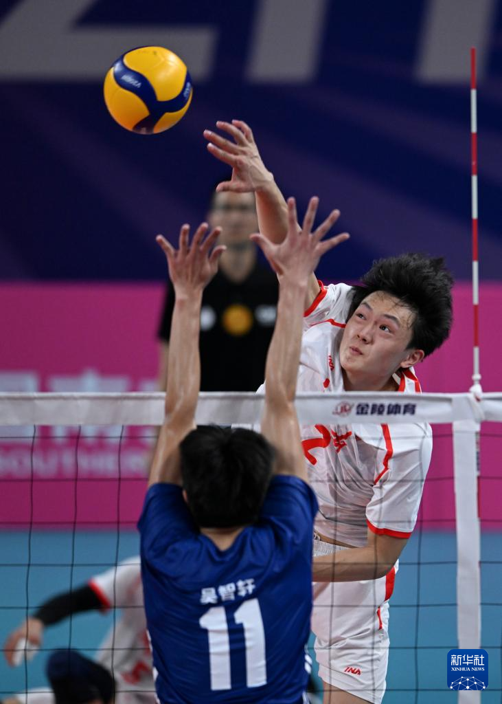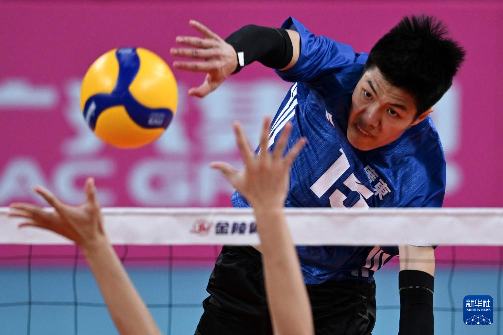 11月7日,湖南队球员段涛(右)在比赛中扣球。
