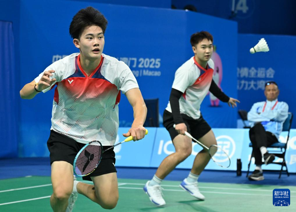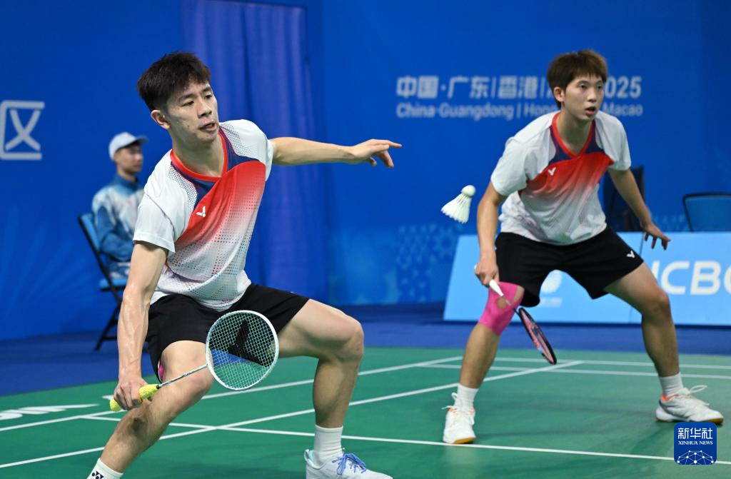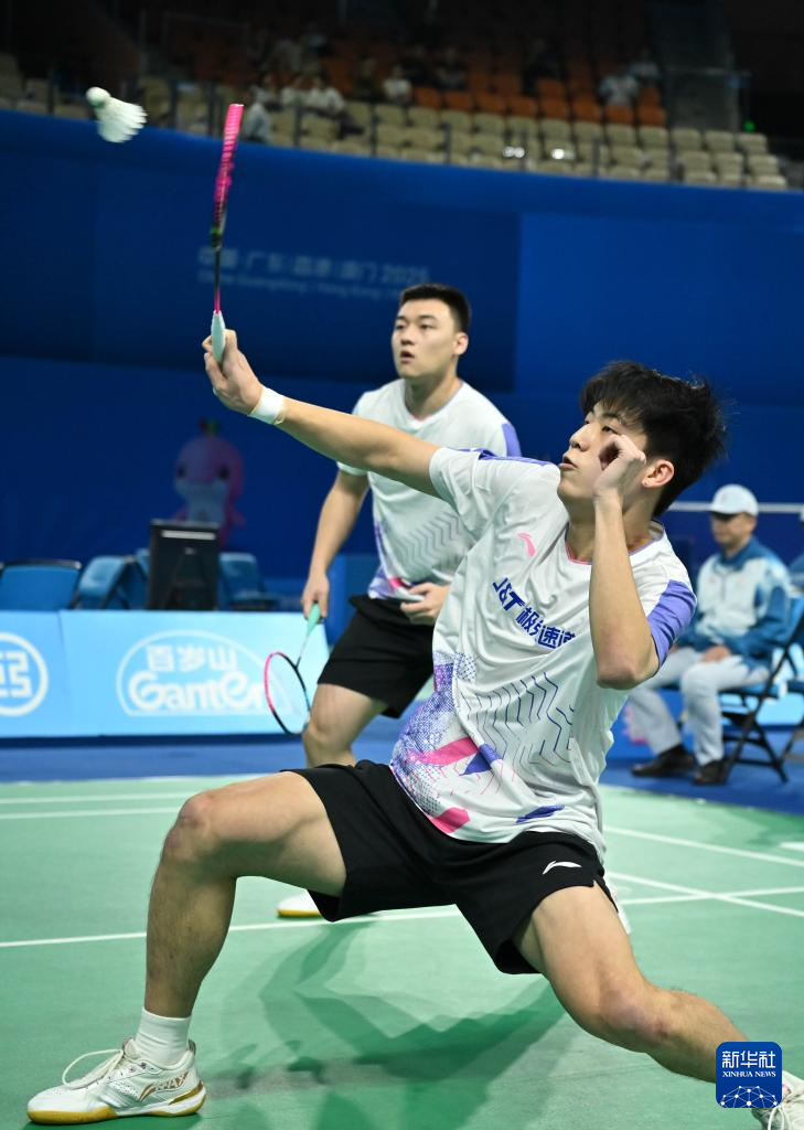 11月7日,广东队组合梁伟铿(右)/任翔宇在男双比赛中。他们2比0战胜江西队组合桂逸俊/徐浩天。最终,广东队3比2战胜江西队。