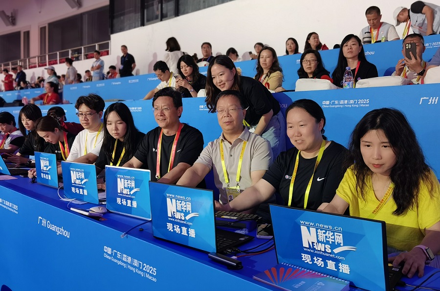 新华网直播团队在中华人民共和国第十五届运动会开幕式现场做好网络直播准备。新华网 倪宏 摄