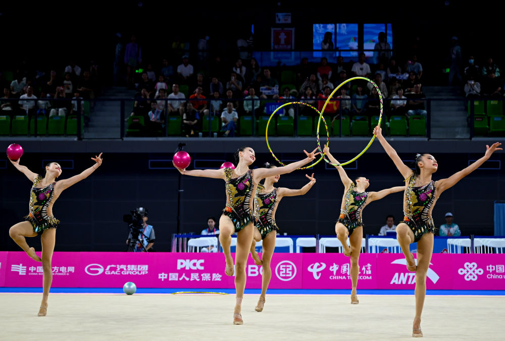 率先亮相的四川队由肖明欣、陈佳琪、赵红玉、谭粤月、梁琪佳组成,该队先是以“国风味”十足的5带成套《春闺梦》获得24.50分,又在随后的3球2圈中拿下全场最高的25.80分,以总分50.30分排名第一,进入决赛。