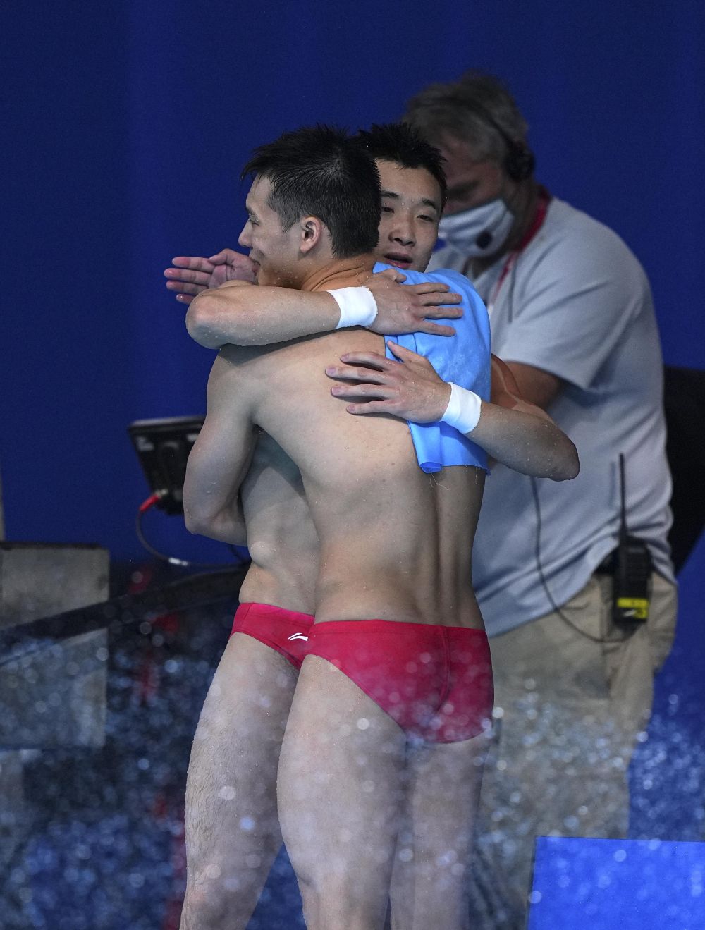 2021年7月26日,中国选手曹缘/陈艾森在东京奥运会跳水男子双人10米台比赛后拥抱。新华社记者 许畅 摄
