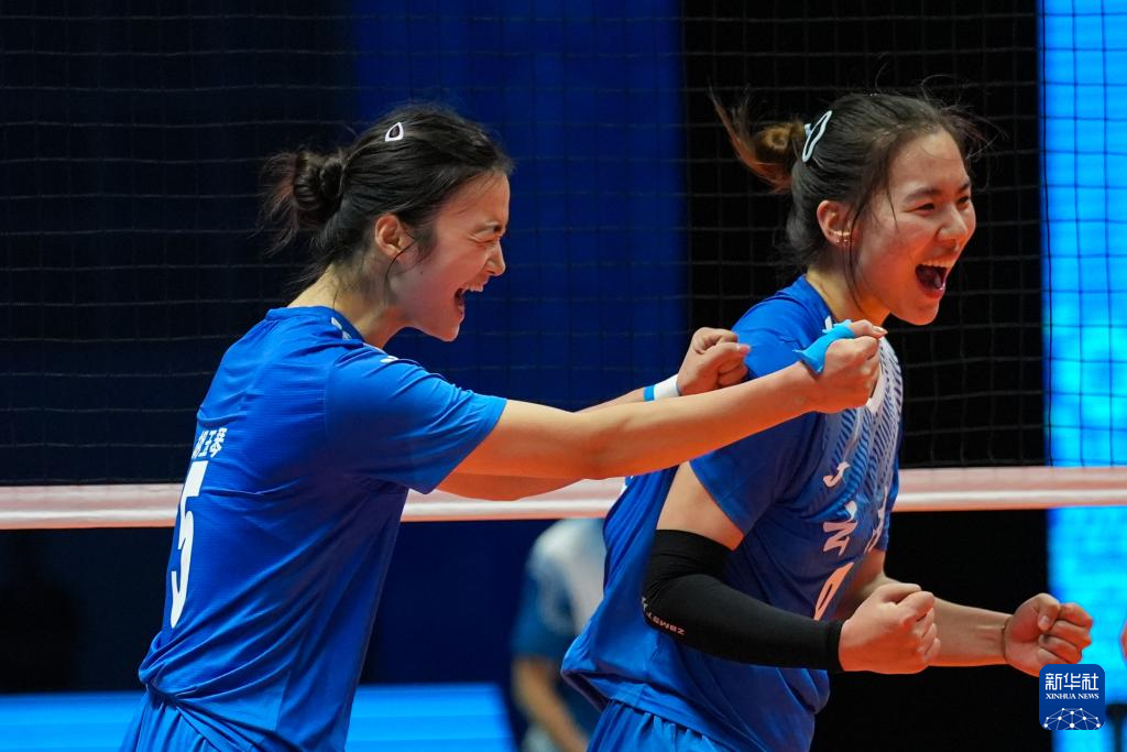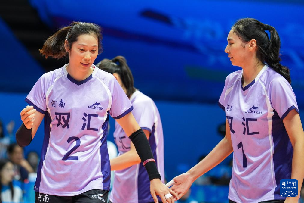 11月8日,河南队球员朱婷(左)在比赛中与队友段梦可庆祝得分。