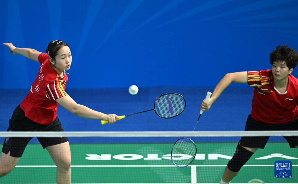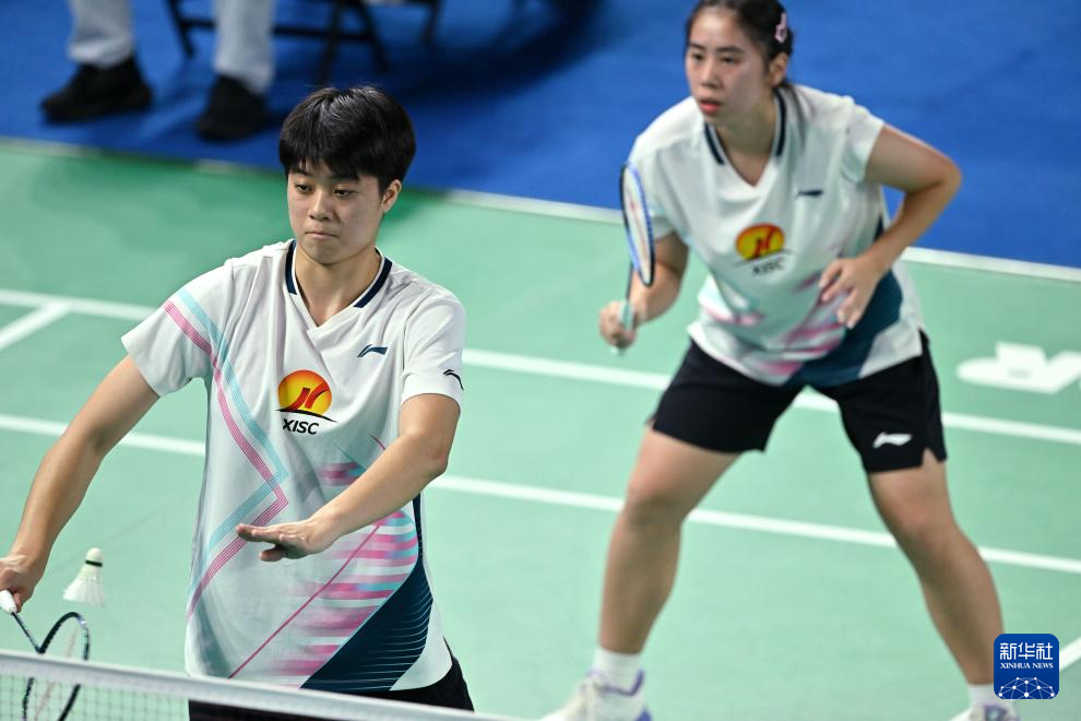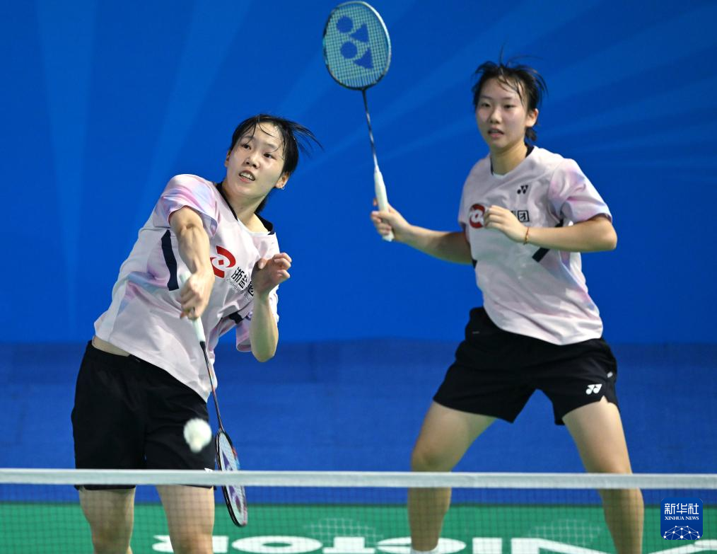 11月8日,湖南队组合谭可萱/张惋晴(左)在女双比赛中回球。她们2比0战胜四川队组合肖雨/李可瑜。最终,湖南队1比3不敌四川队,无缘下一轮。