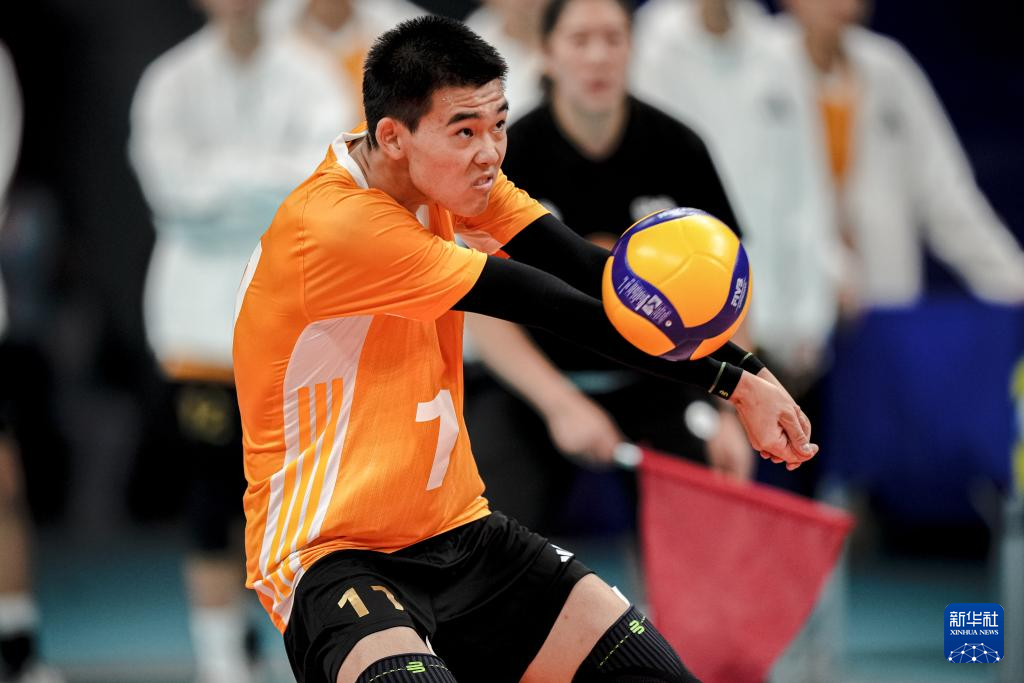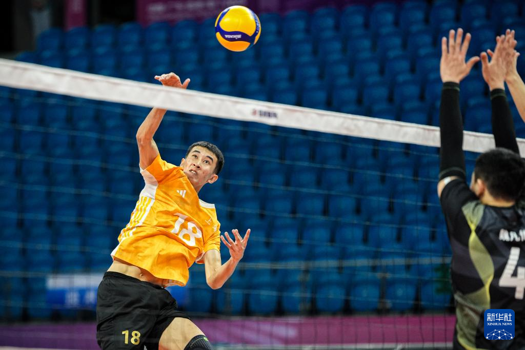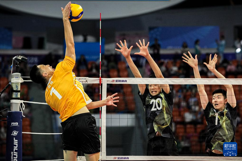 11月8日,江苏队球员刘添源(中)在比赛中扣球。