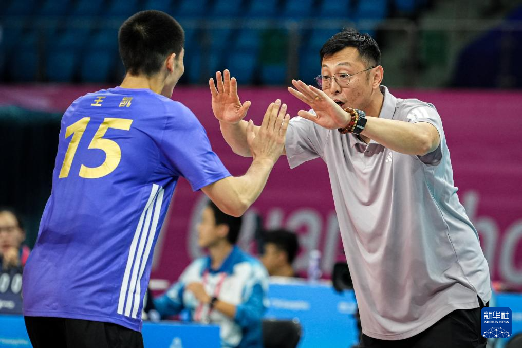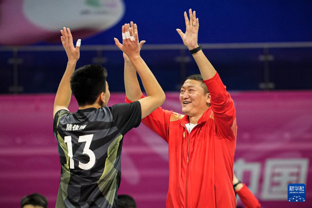11月8日,江苏队主教练陆振(右)在比赛中与球员随佳博庆祝得分。