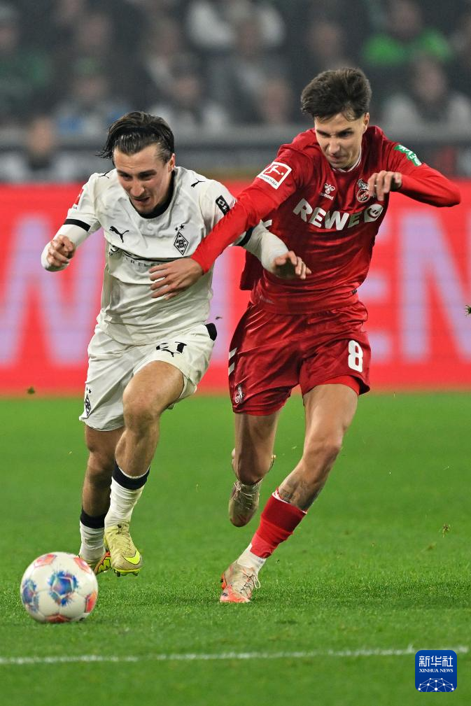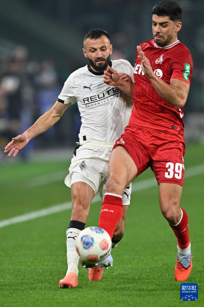 11月8日,门兴格拉德巴赫队球员塔巴科维奇(左)和科隆队球员卡明斯基在比赛中拼抢。