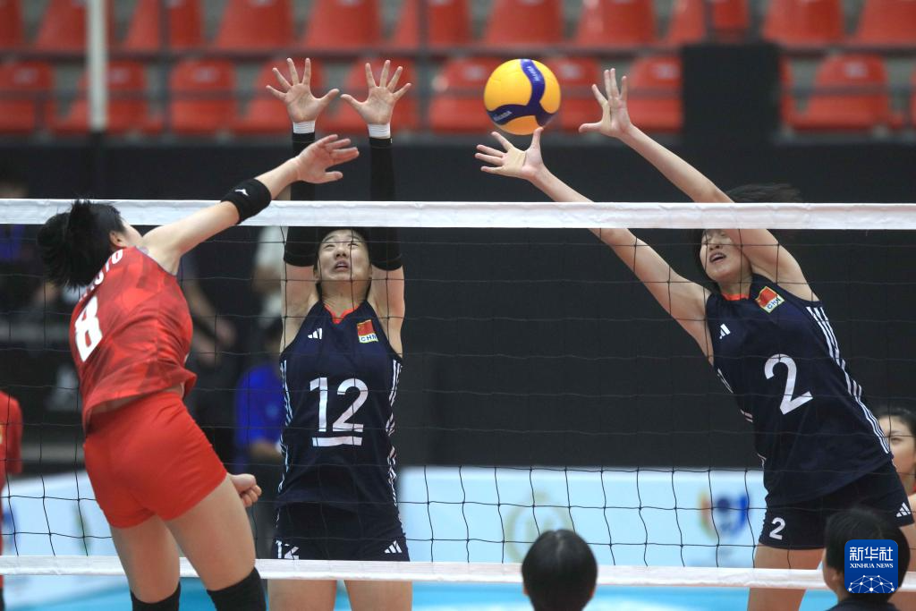 11月8日,中国队球员徐睿琳(右)、范元晟(中)在比赛中拦网。