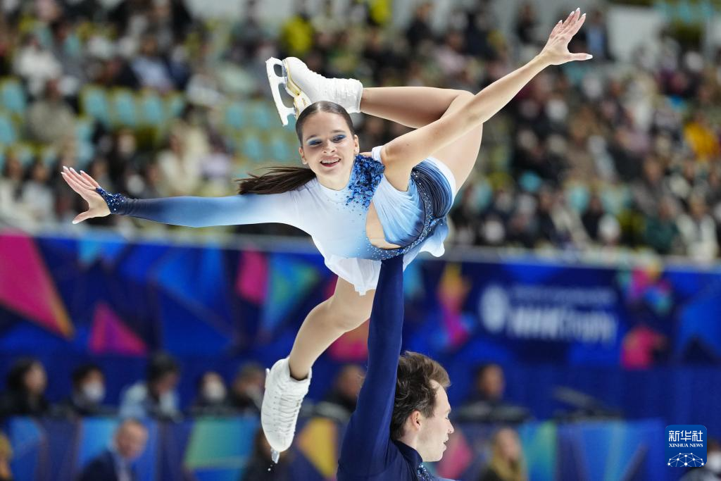 11月8日,匈牙利组合帕夫洛娃(上)/斯维亚琴科在双人滑自由滑比赛中。最终,他们获得双人滑亚军。