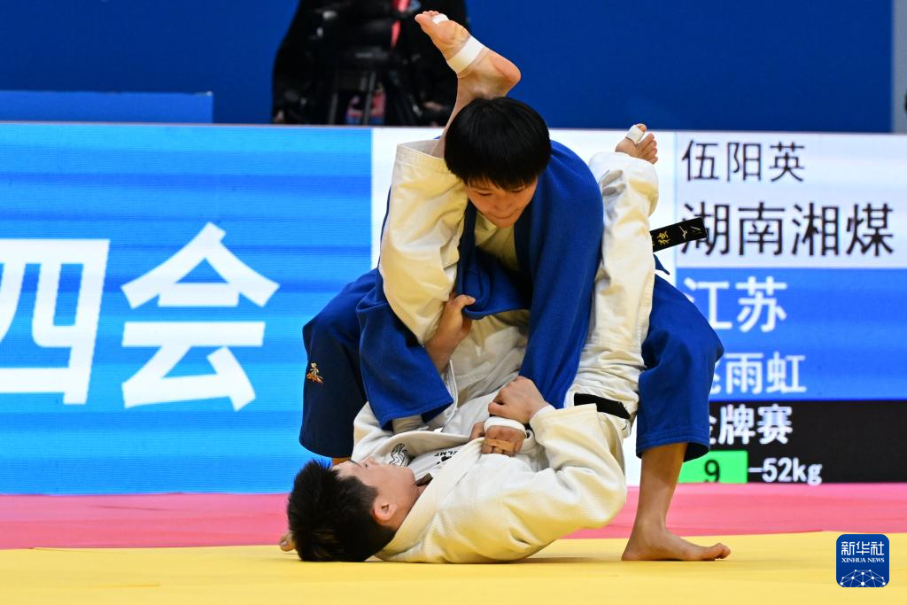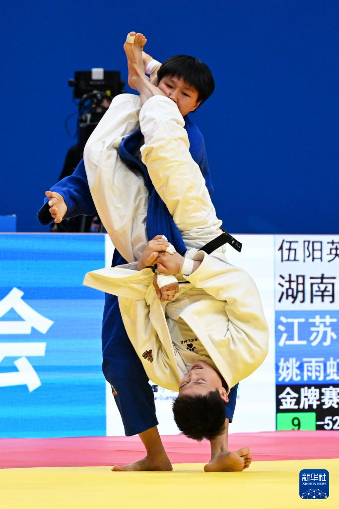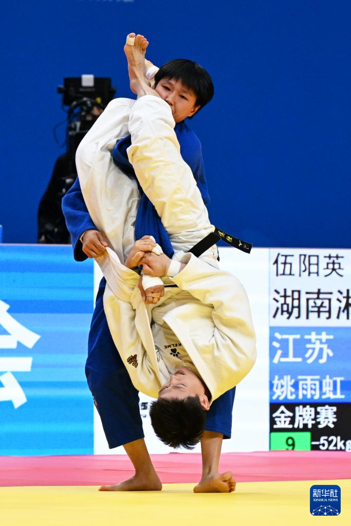 11月10日,江苏队选手姚雨虹(后)和湖南队选手伍阳英在女子52公斤级金牌赛中。最终,姚雨虹战胜伍阳英获得金牌。