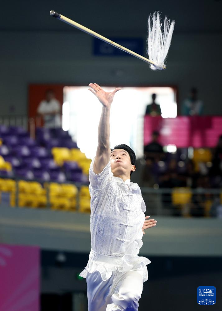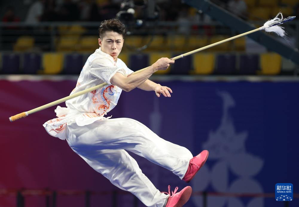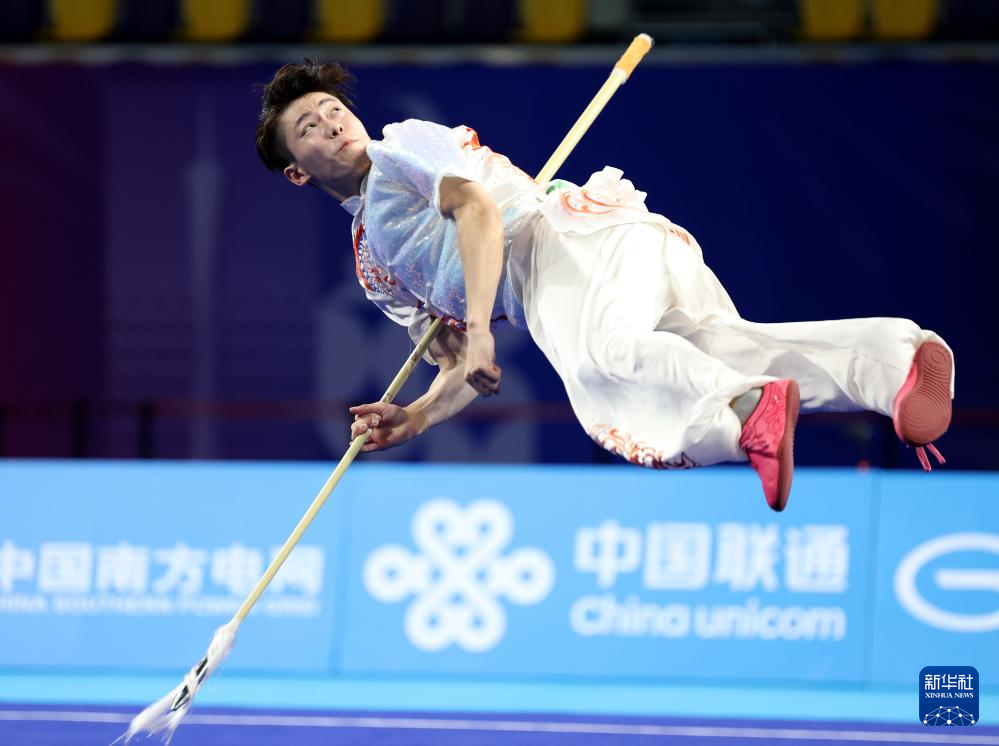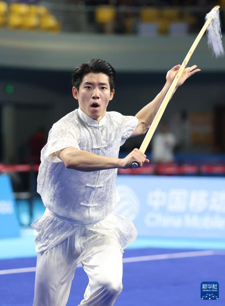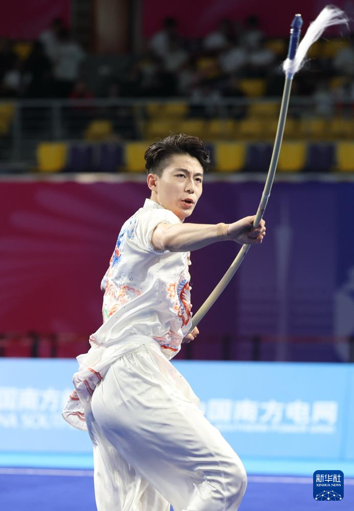11月10日,山东队选手许澳在团体赛男子枪术比赛中。最终,山东队夺得金牌。