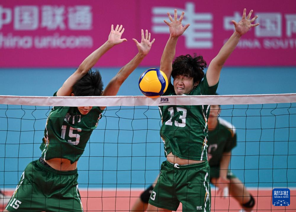 11月10日,澳门队球员吴泳滔(右一)和甘力宏(右二)在比赛中拦网。