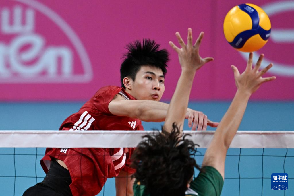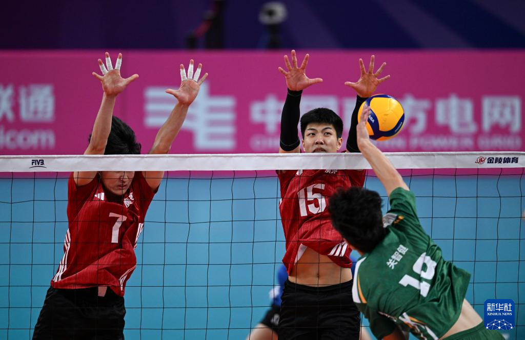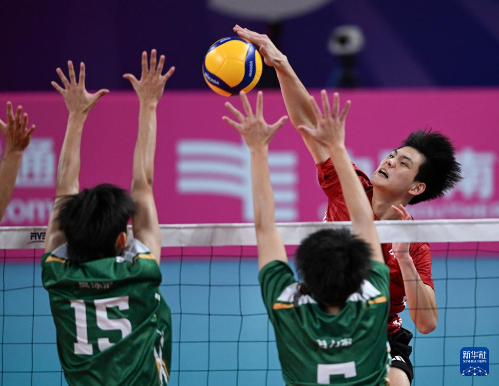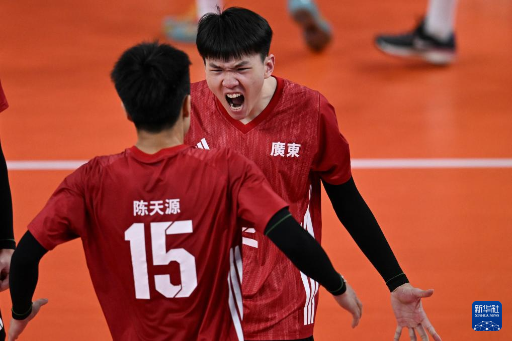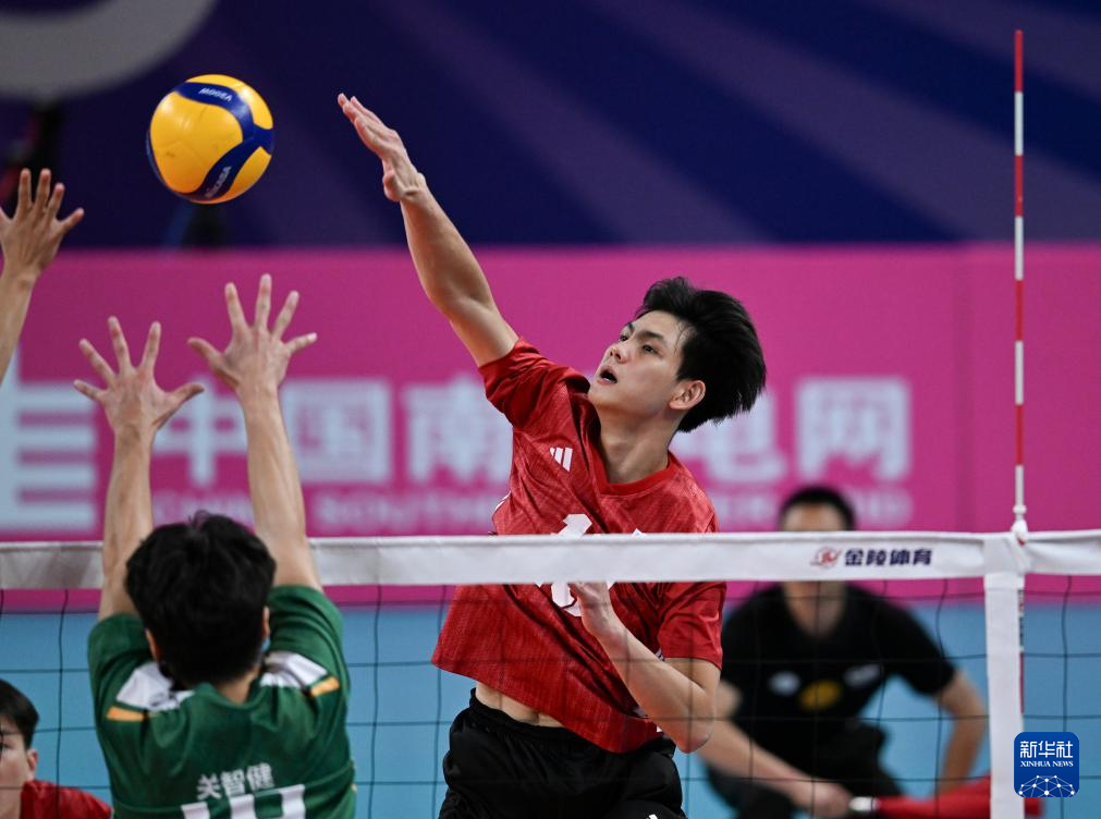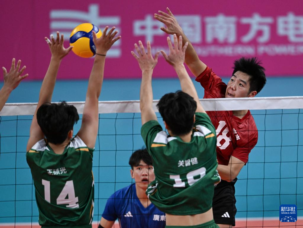 11月10日,广东队球员伍浩林(右一)在比赛中扣球。