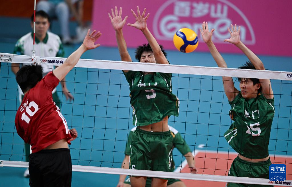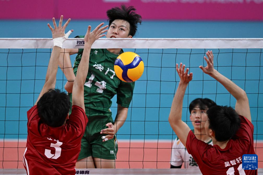 11月10日,澳门队球员王硕光(左二)在比赛中扣球。