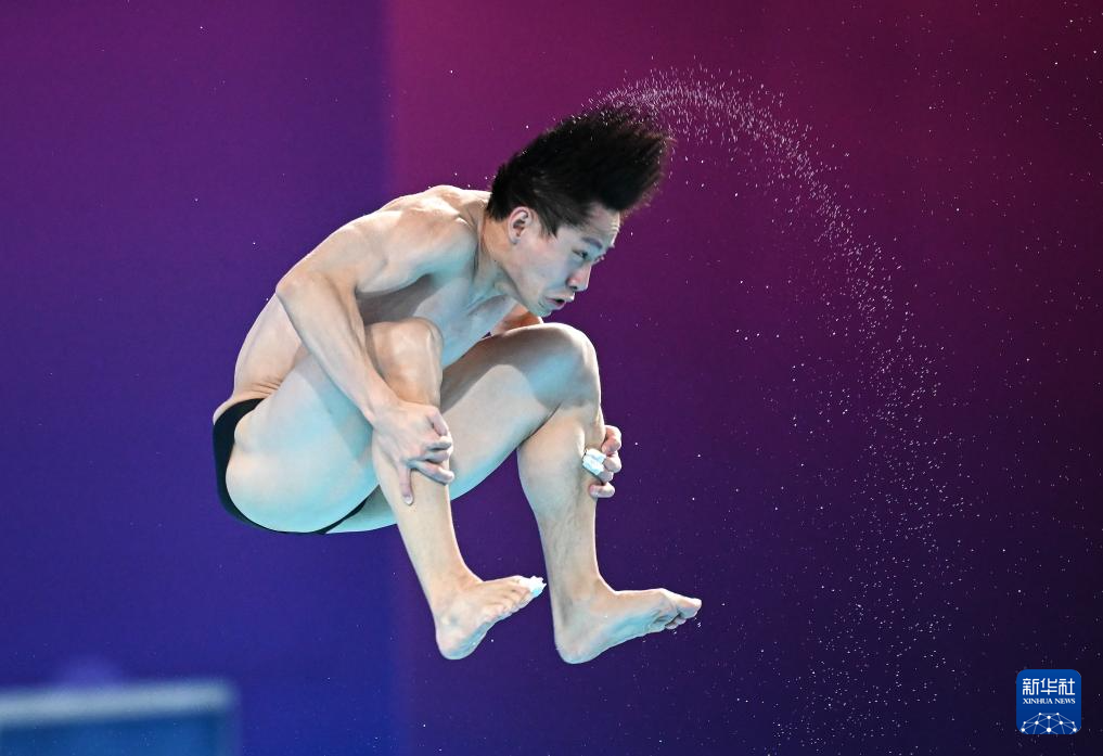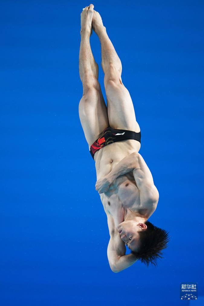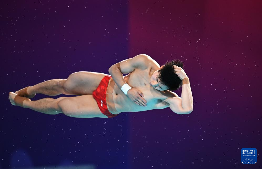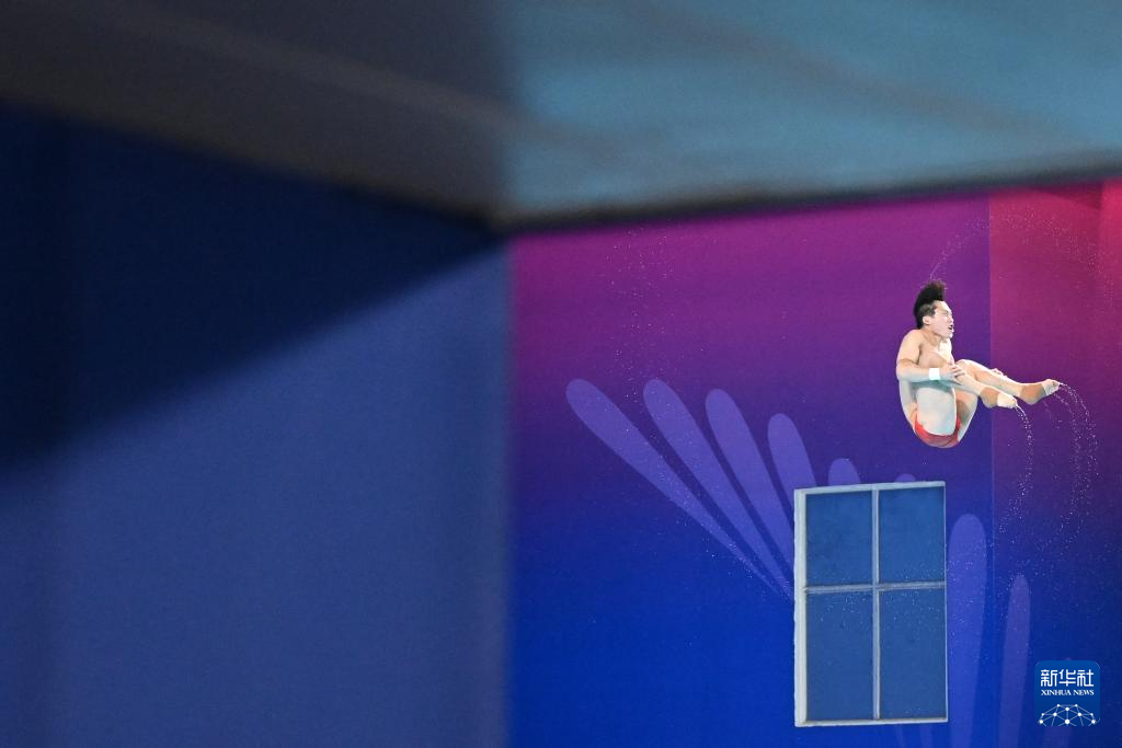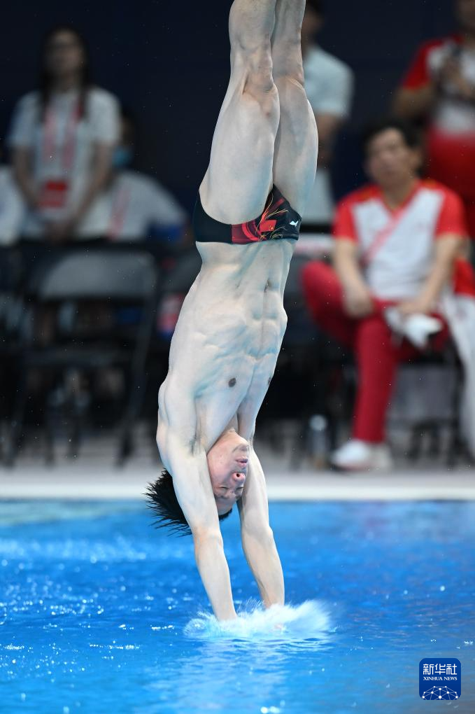 11月10日,湖北队选手王宗源在比赛中完成动作后准备出水。