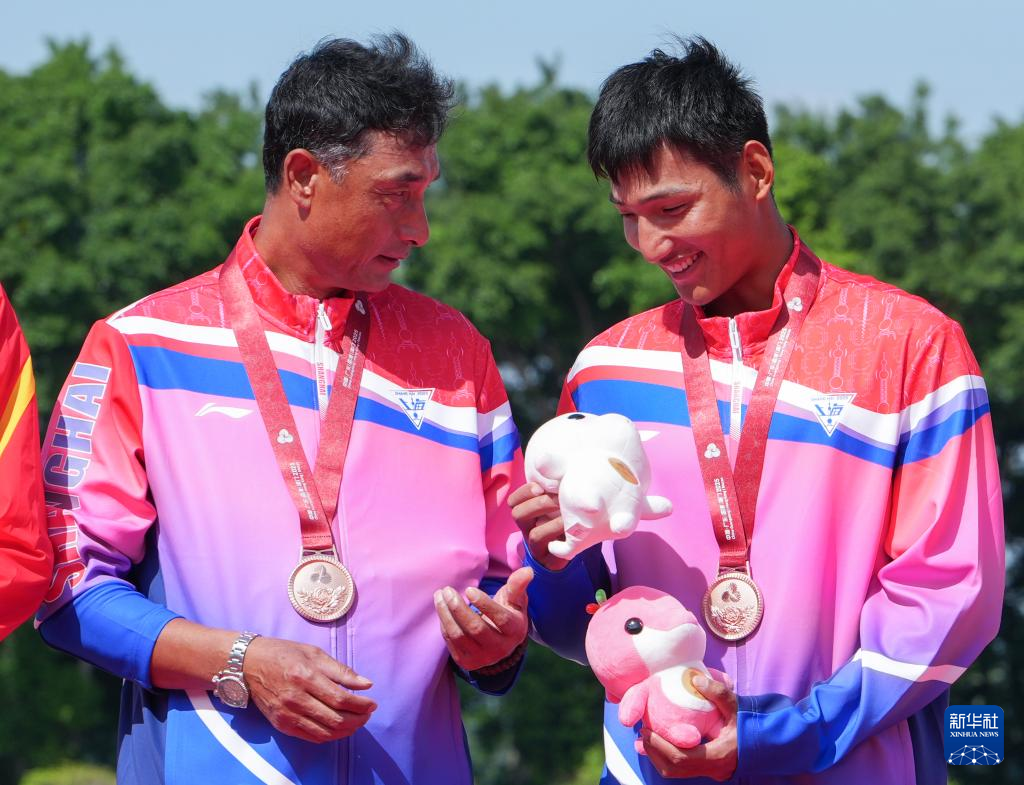 11月10日,季军上海队选手张秀立(右)在颁奖仪式上和教练交换全运会吉祥物。