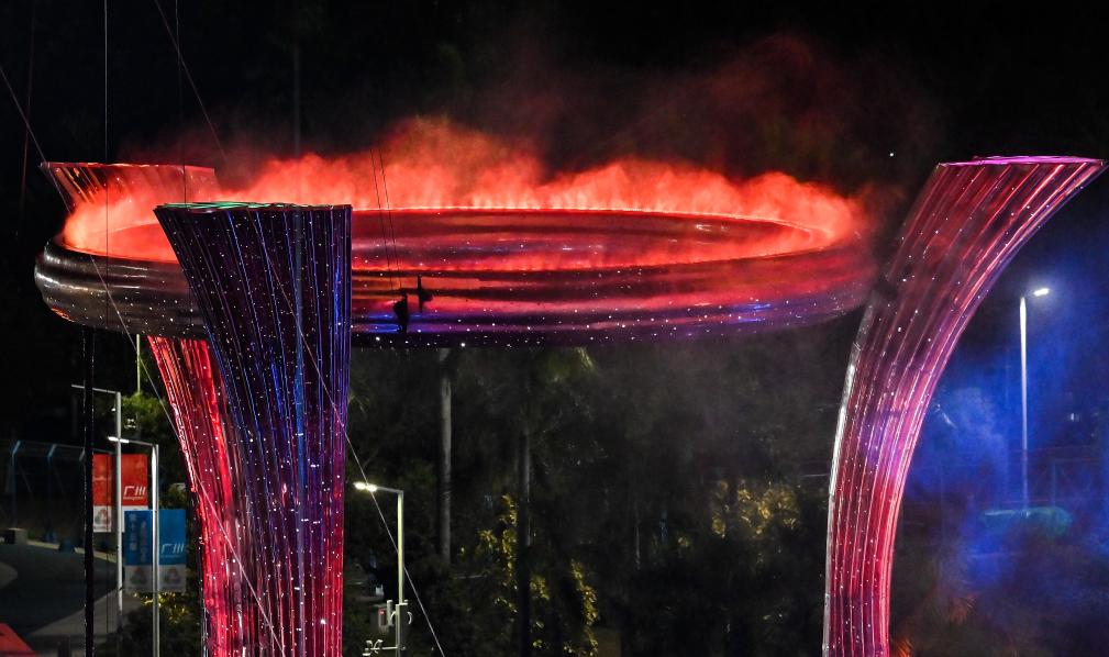新华社广州11月10日电(记者胡拿云)在9日晚举行的第十五届全国运动会开幕式上,一场融合科技与绿色的点火仪式惊艳亮相。巨大的“水舞台”上,三位火炬手踏浪而来、拾级而上。在主火炬塔被点燃的瞬间,映入观众眼帘的不是真实的火焰,而是由电光水雾系统模拟的“科技火焰”。