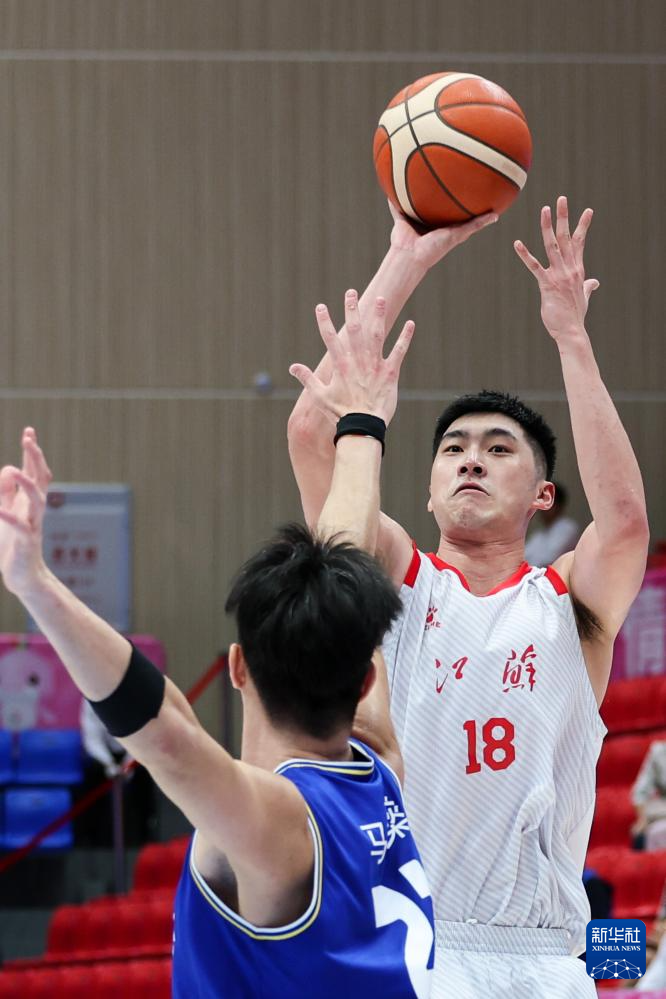 11月10日,江苏队球员蒋浩然(右)在比赛中投篮。