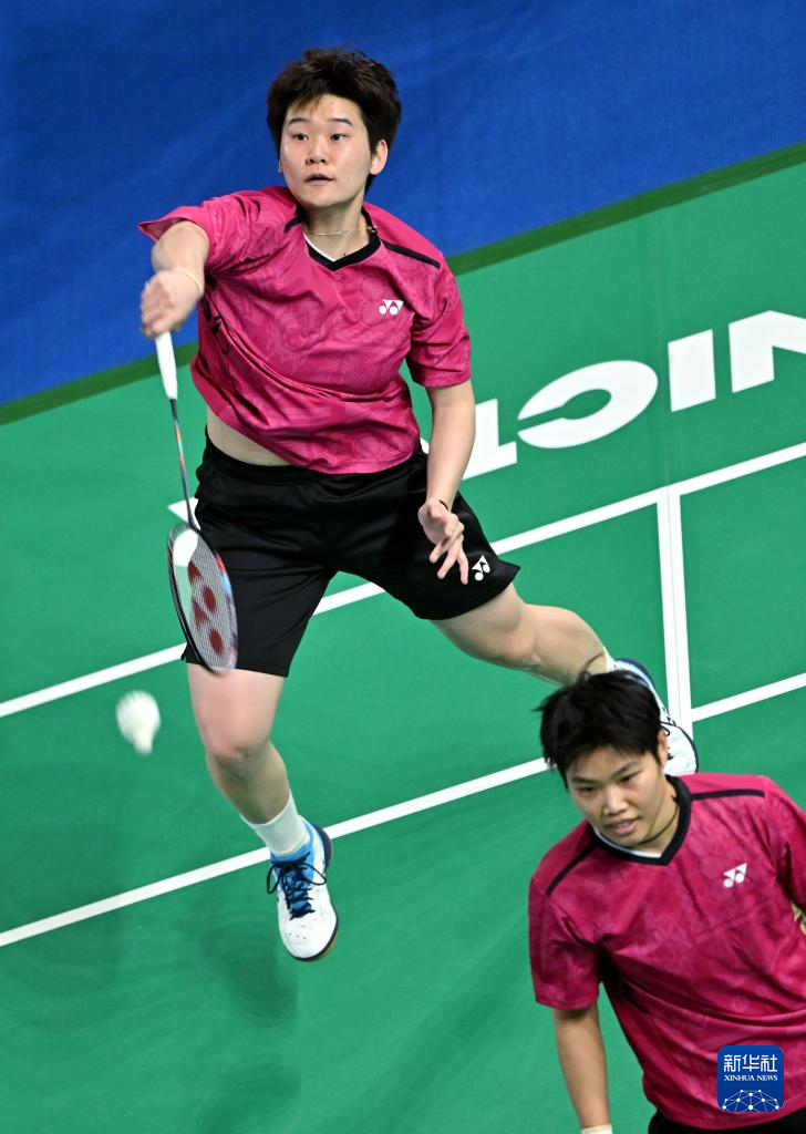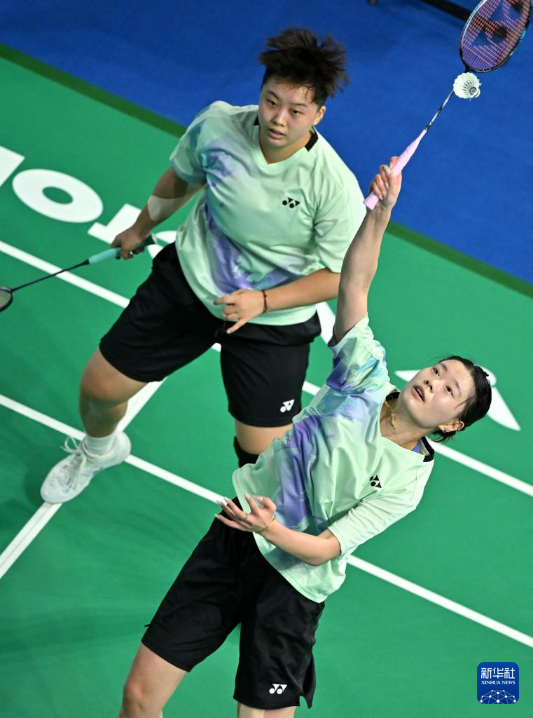 11月10日,福建队组合黄东萍/谭宁(左)在女双比赛中回球。她们2比0战胜山东队组合陈莹雪/张景儿。