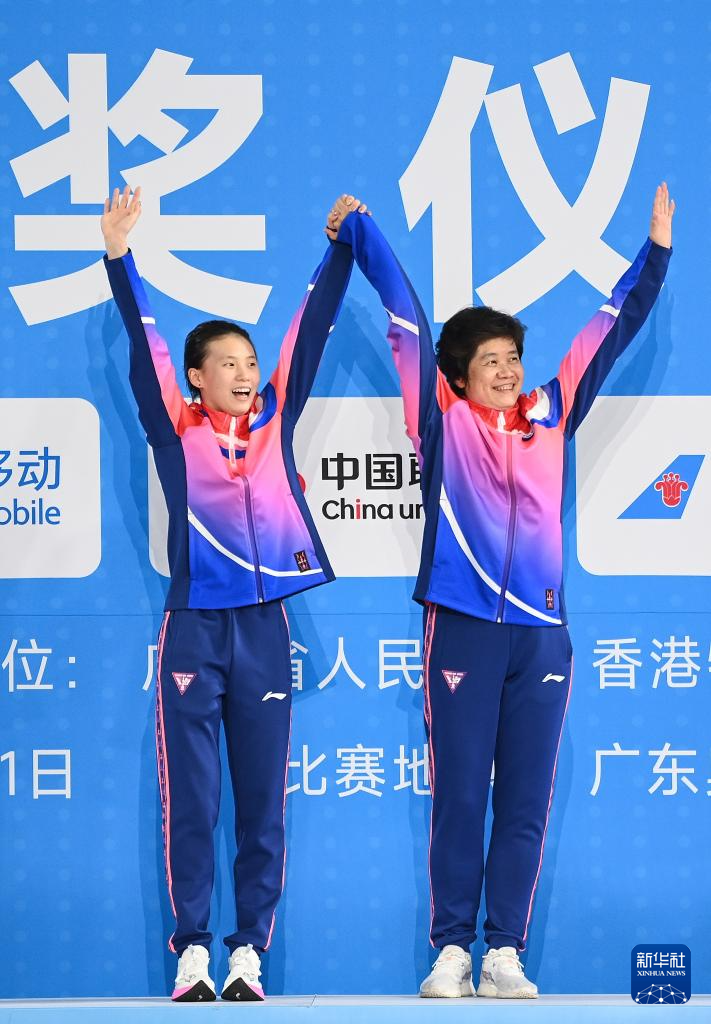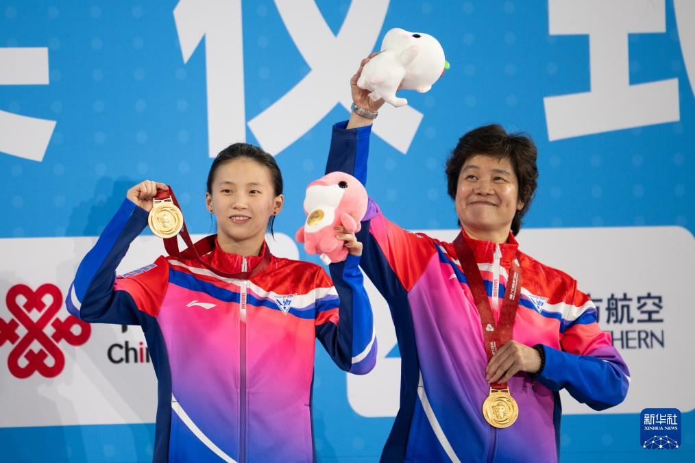 11月10日,获得冠军的上海队选手陈芋汐(左)和教练在颁奖仪式上庆祝。