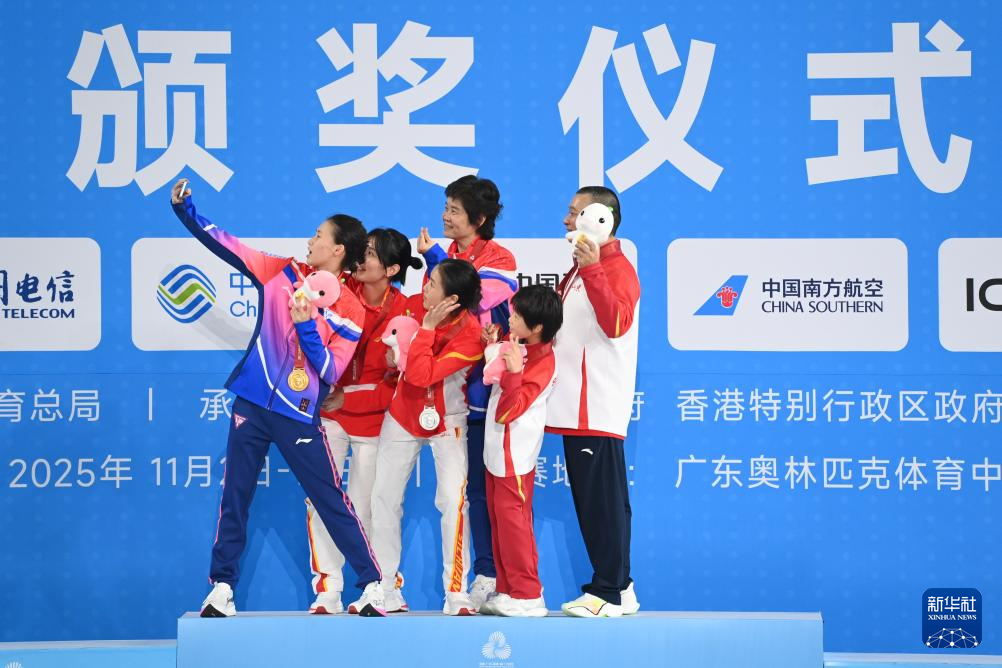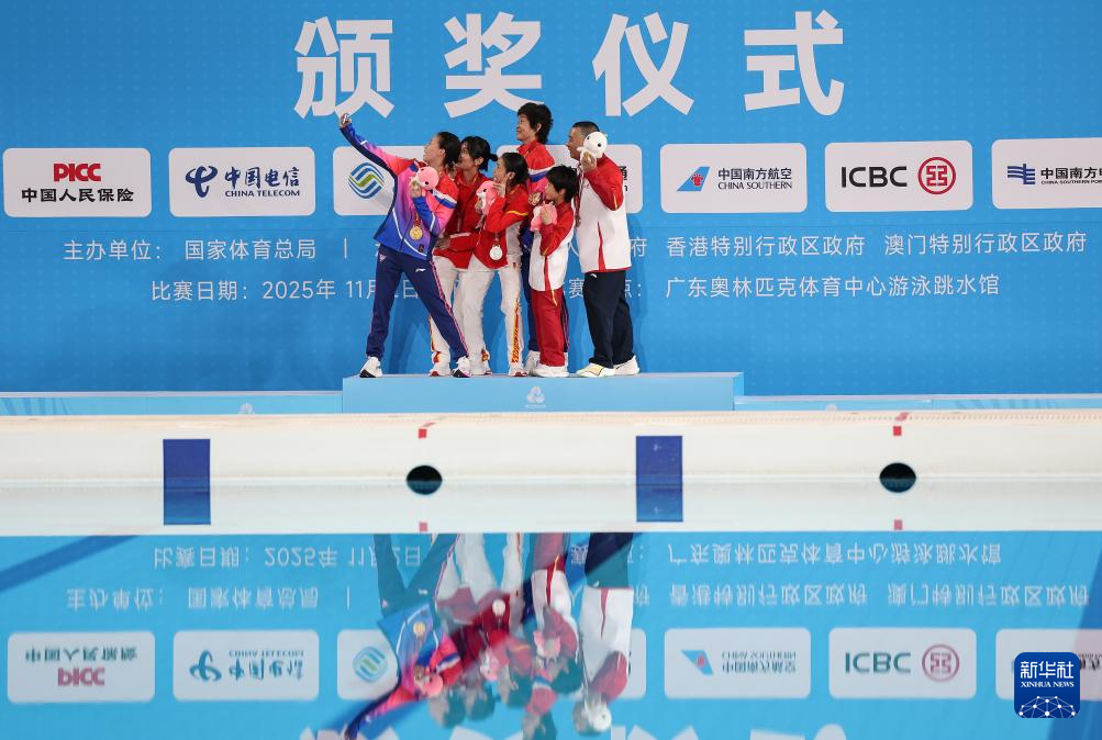 11月10日,获得冠军的上海队选手陈芋汐(左一)、获得亚军的四川队选手卢为(左三)、获得季军的山东队选手刘紫涵(右二)在颁奖仪式上与教练自拍合影。