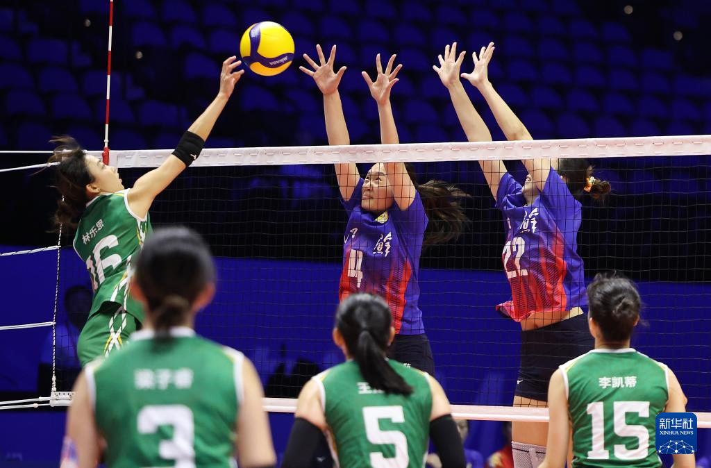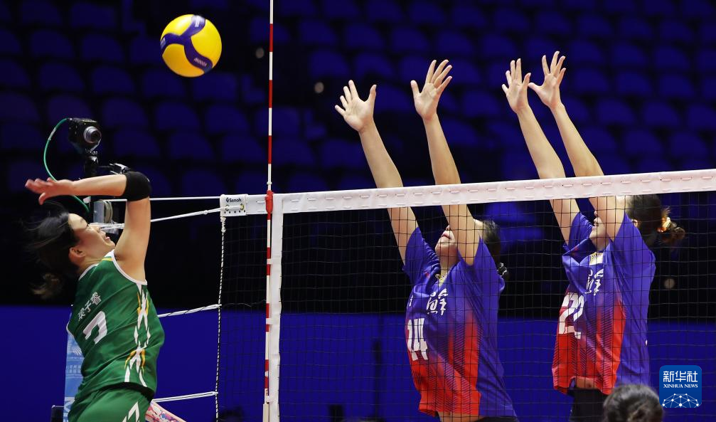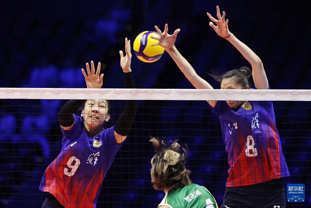 11月10日,江苏队球员万梓玥(左)和吴梦洁(右)在比赛中拦网。