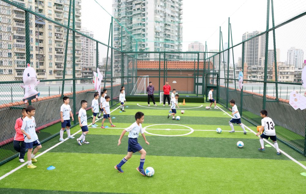 11月3日,广州市永曜北小学的学生在学校楼顶天台的足球场踢球。近年来,广州市越秀区通过盘活桥下空间、屋顶平台及街旁闲置地等城市的"金角银边",拓展老城区运动空间,激发全民健身活力。新华社记者 卢汉欣 摄