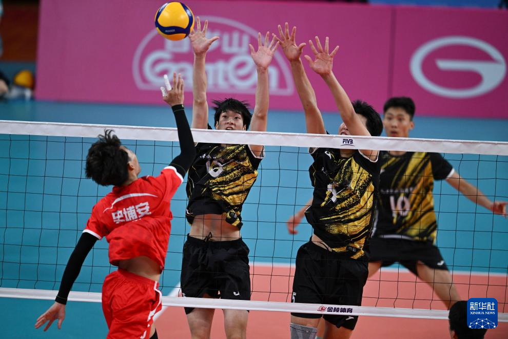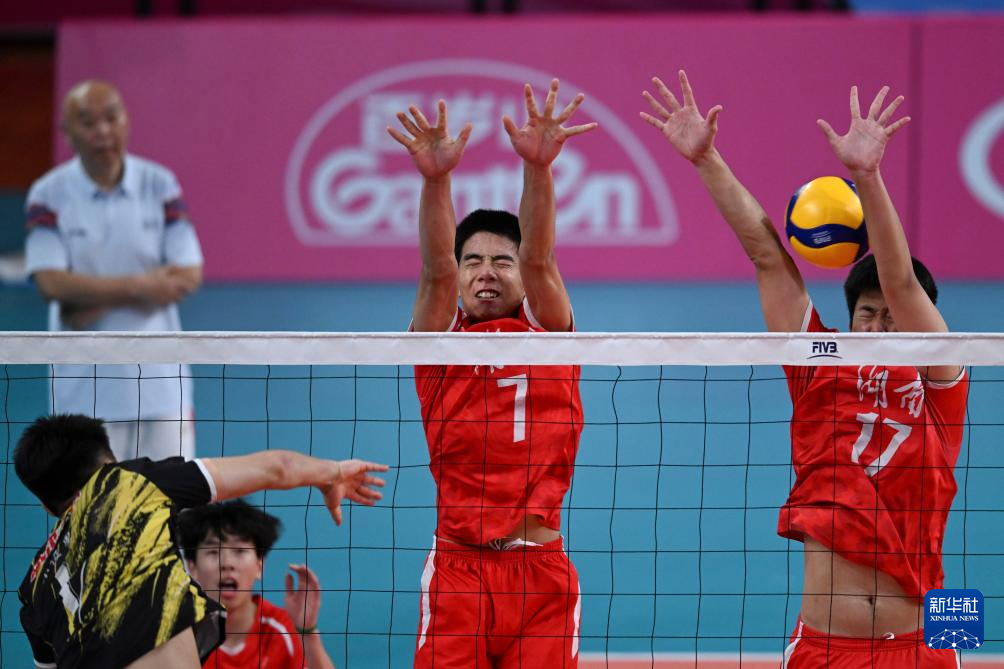 11月10日,湖南队球员王炳均(右一)和喻咨臣(右二)在比赛中拦网。