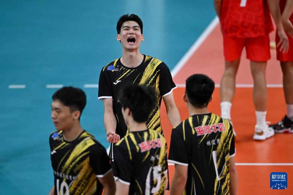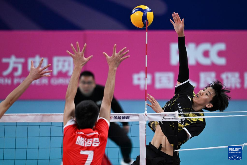 11月10日,天津队球员林俊男(左二)在比赛中扣球。