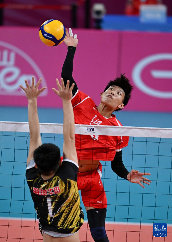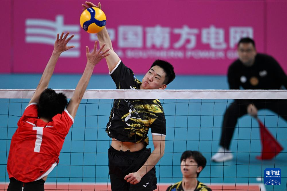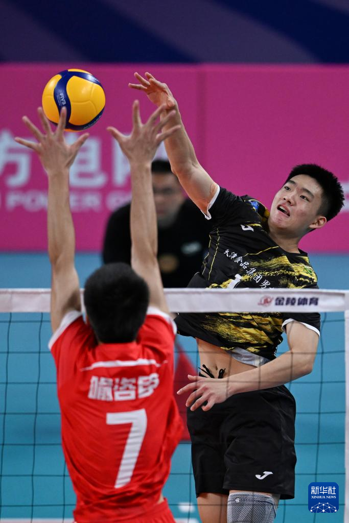 11月10日,天津队球员林俊男(右)在比赛中扣球。