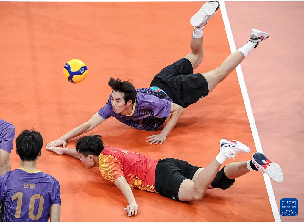 11月11日,福建队球员苏昊天(右上)、薛正(右下)在比赛中救球。