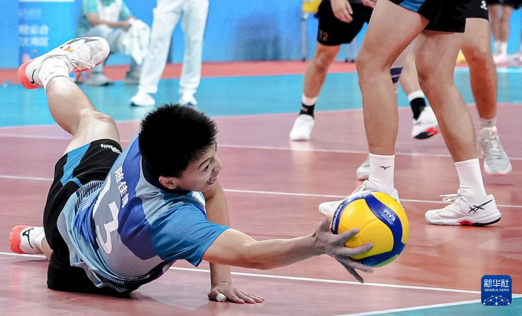 11月11日,江苏队球员随佳博(下)在比赛中救球。
