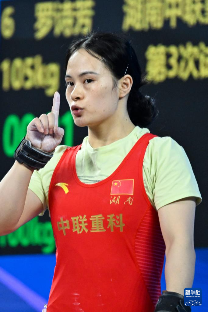 11月11日,湖南队选手罗诗芳在抓举比赛中提醒观众保持安静。她最终夺得冠军。
