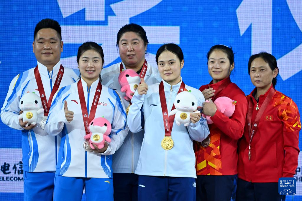 11月11日,冠军湖南队选手罗诗芳(右三)、亚军浙江队选手裴鑫依(左二)和季军重庆队选手罗小敏(右二)在颁奖仪式上和教练合影。