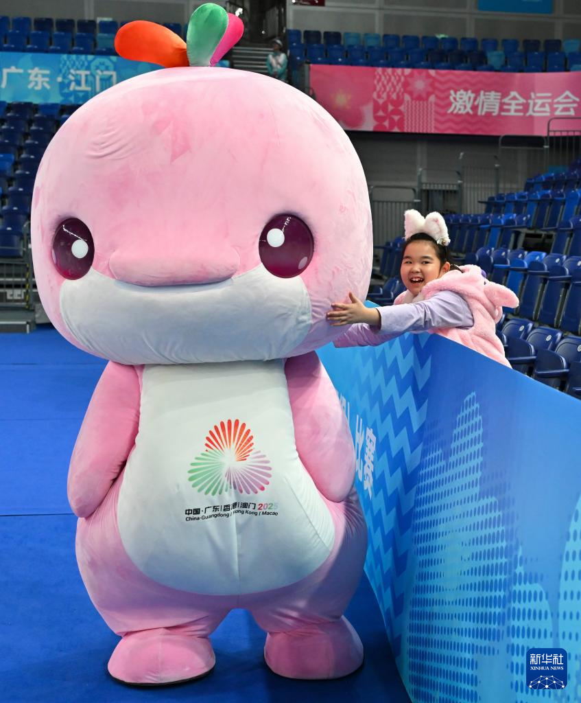 11月11日,一名小观众在赛后与吉祥物“乐融融”合影。