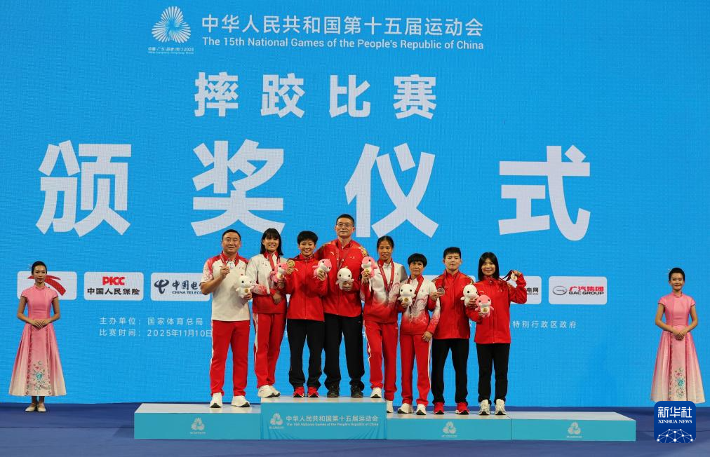 11月10日,冠军江苏队选手洪可新(左四)、亚军广东队选手梁虹(左三)、季军广东队选手冯泳欣(右五)和江苏队选手谢梦宇(右二)在颁奖仪式上。