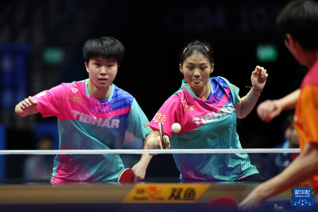 11月11日,四川队组合夏志芃(上左)/高雨欣(上右)在比赛中回球。