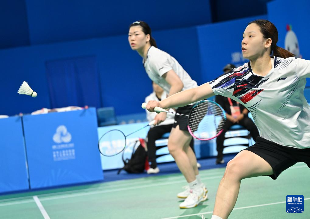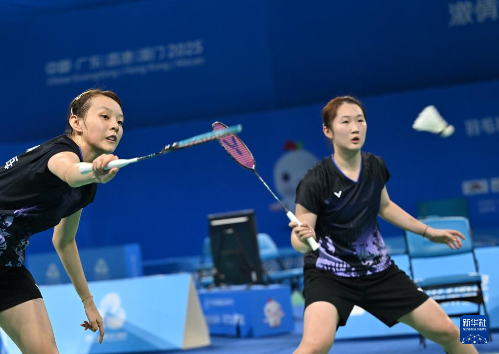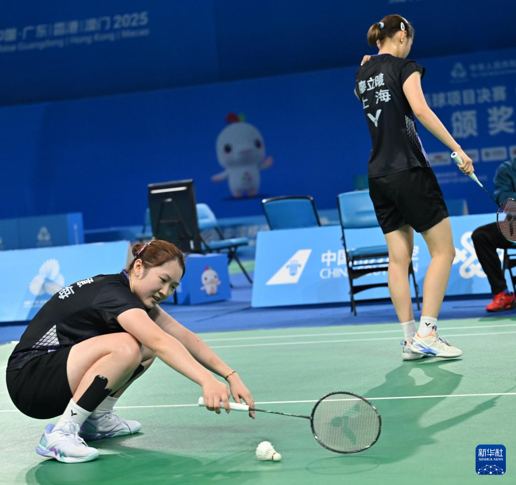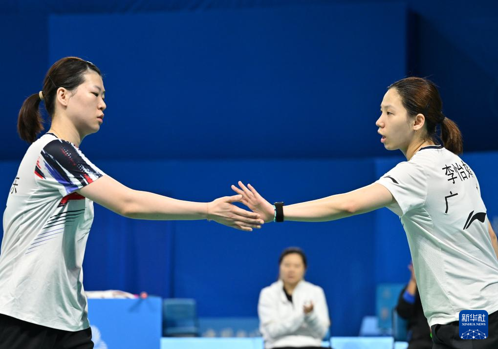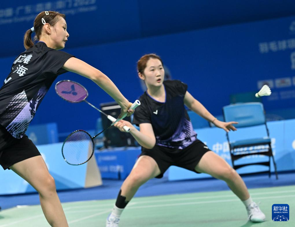 11月11日,广东队组合李怡婧(右)/罗徐敏在女双比赛中。她们2比0战胜上海队组合罗意/廖立曦。