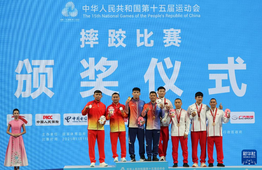 11月11日,获得冠军的广西队选手陆锋(左五),获得亚军的新疆队选手阿黑由·吐尔逊(左二),获得季军的内蒙古队选手巴图青格乐(右四)、云南队选手金文猛(右二)和教练、嘉宾在颁奖仪式上合影。