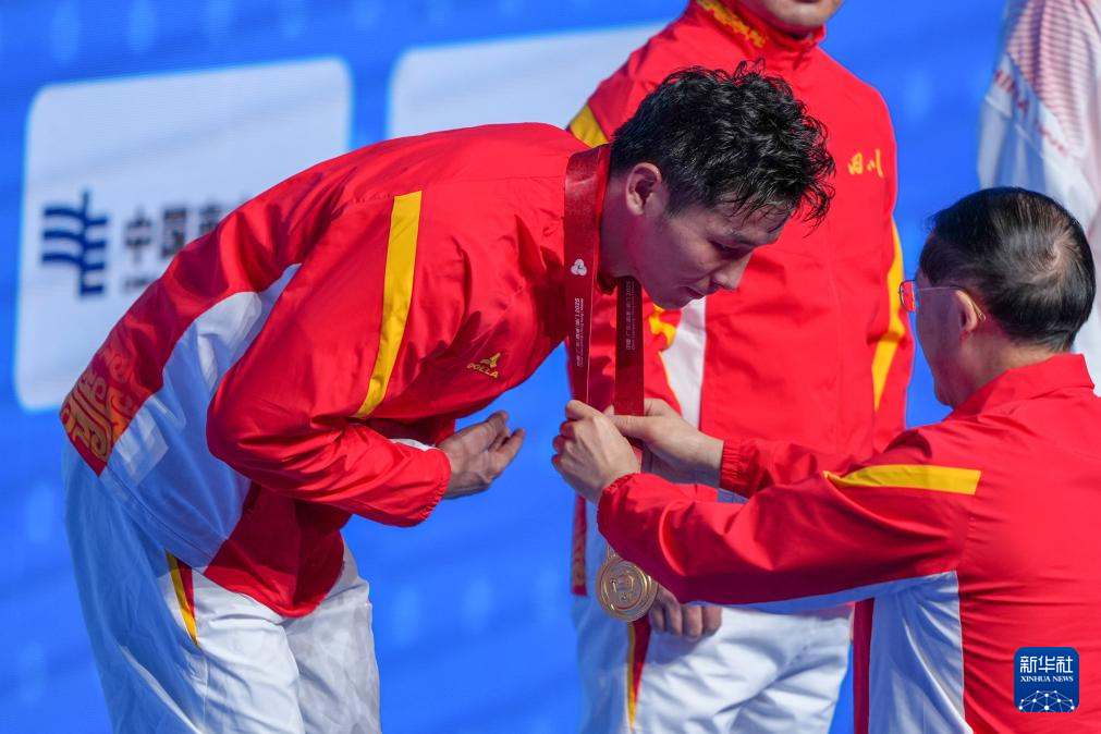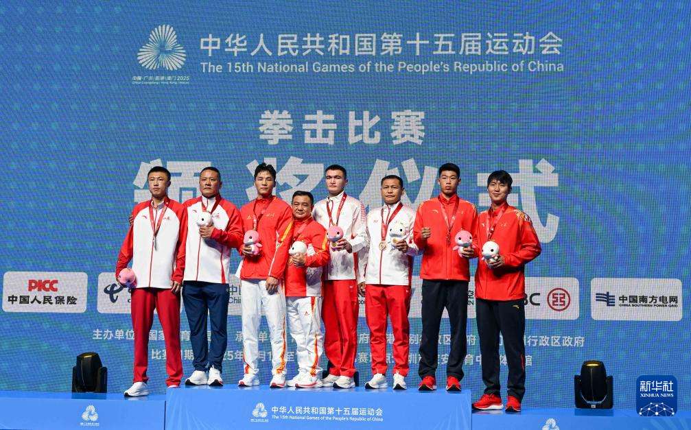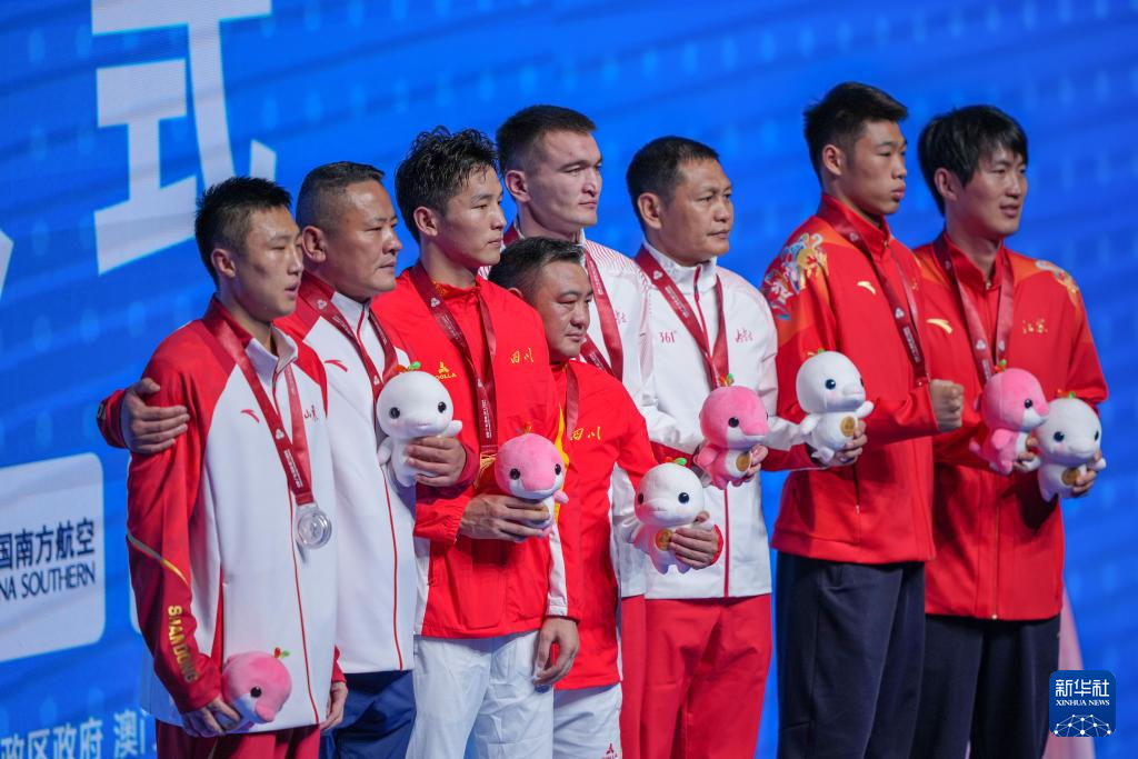 11月11日,冠军四川队选手王小保(左三)、亚军山东体育学院队选手王金祥(左一)、季军内蒙古队选手叶尔波力·伟山(左五)、季军江苏队选手杜浩然(右二)与教练员在颁奖仪式上合影。