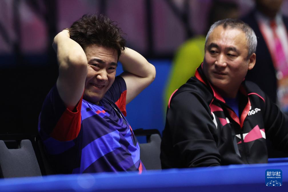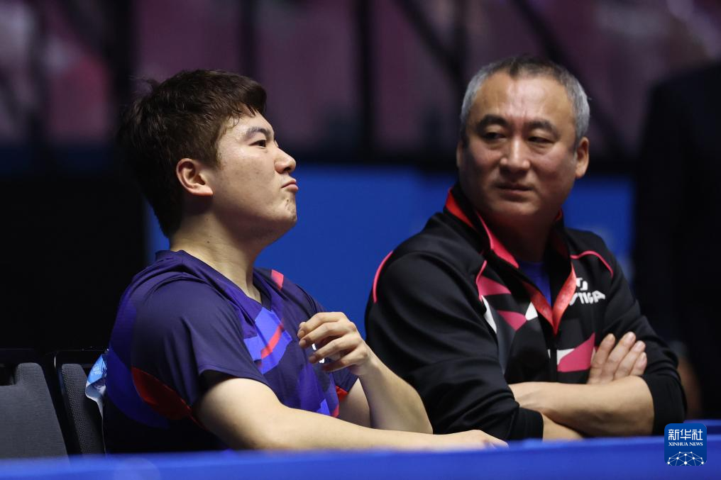 11月11日,河北队选手梁靖崑(左)在休息时与教练交流。
