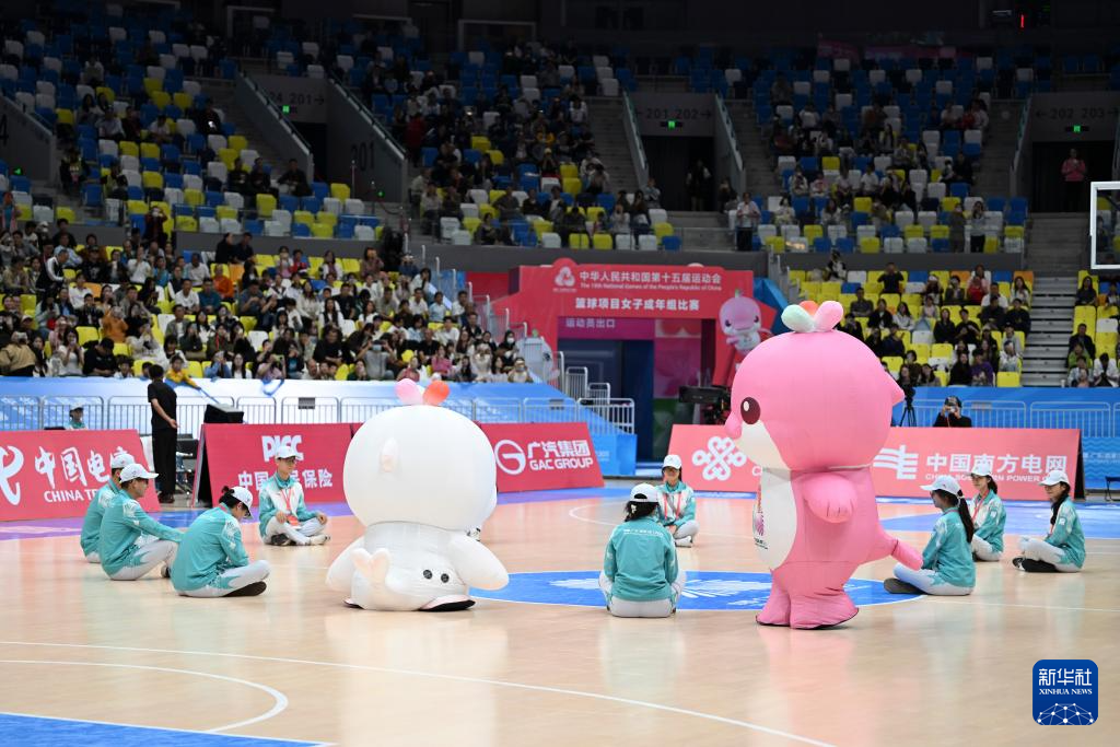11月11日,第十五届全国运动会吉祥物“喜洋洋”与“乐融融”(右四)在比赛间隙为观众表演节目。