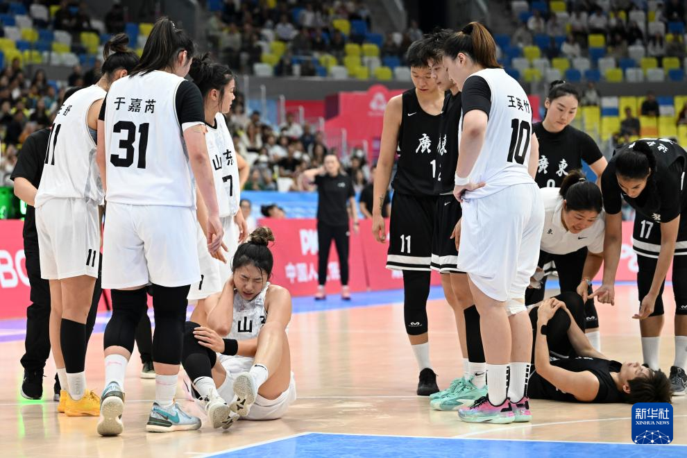 11月11日,广东队球员杨力维(右下)与山东队球员赵雅琢(左下)发生冲撞后倒地。