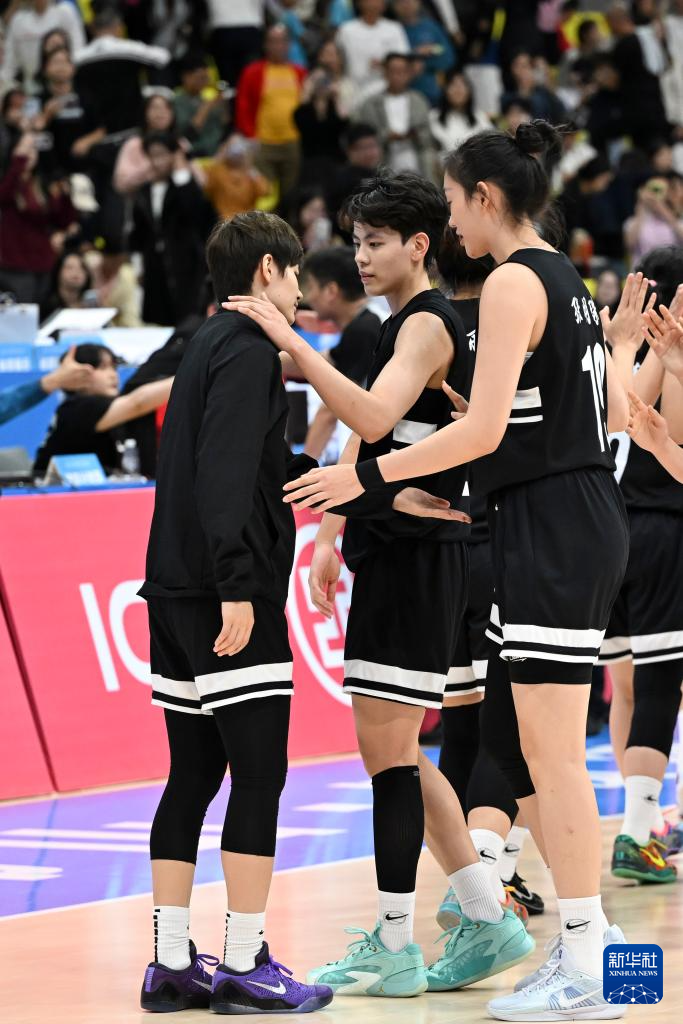 11月11日,广东队球员杨舒予(中)和张明珠(右)在赛后安慰受伤的队友杨力维。