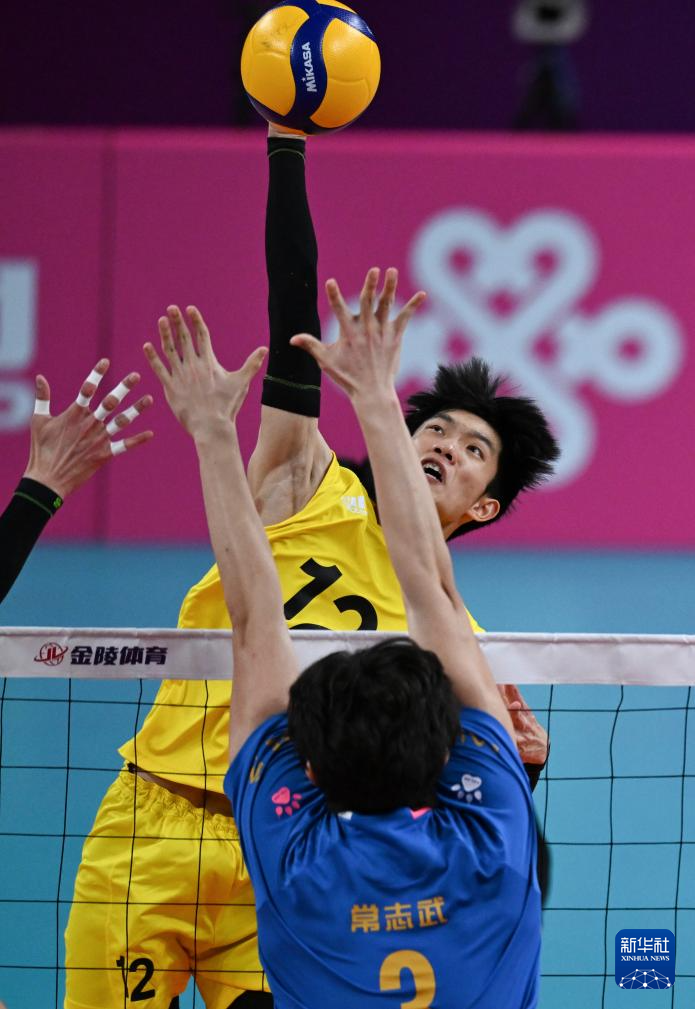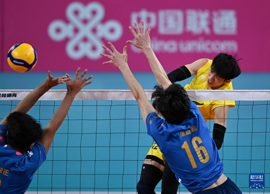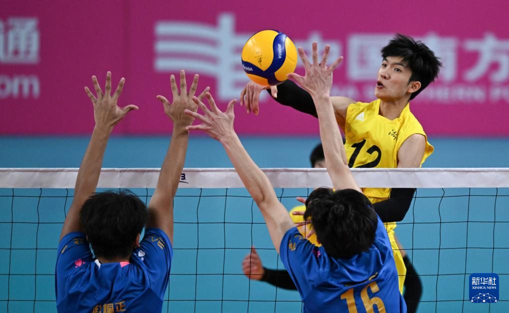 11月10日,浙江队球员曾洋杰(右一)在比赛中扣球。