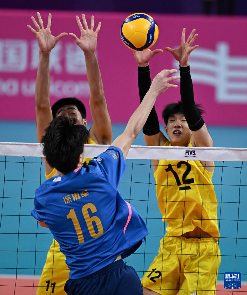 11月10日,浙江队球员盛楷恩(右一)和叶首君(右二)在比赛中拦网。