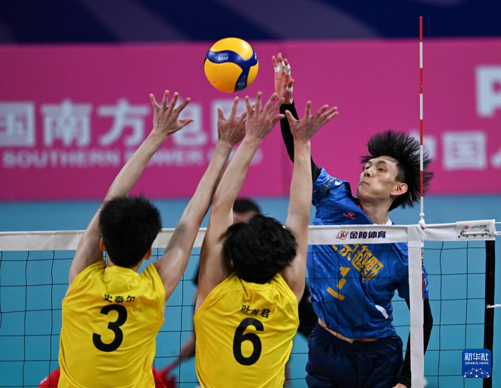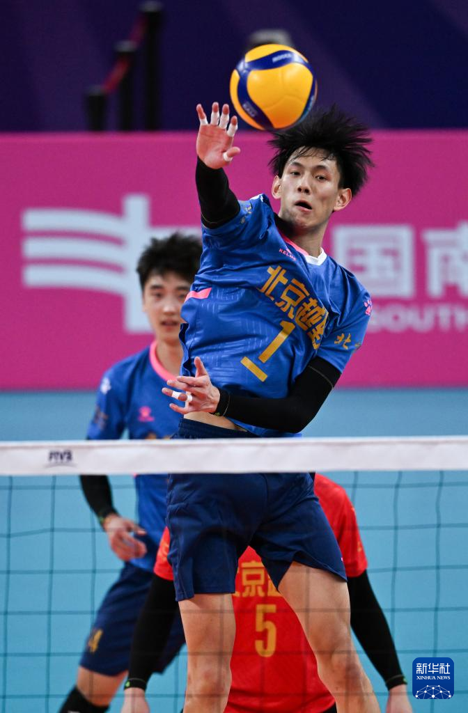 11月10日,北京队球员李卓洋(右一)在比赛中扣球。