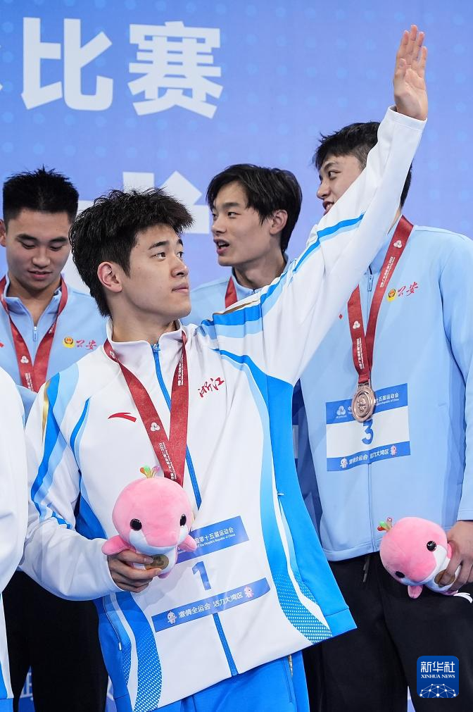 11月10日,浙江队选手汪顺在颁奖仪式上向观众致意。