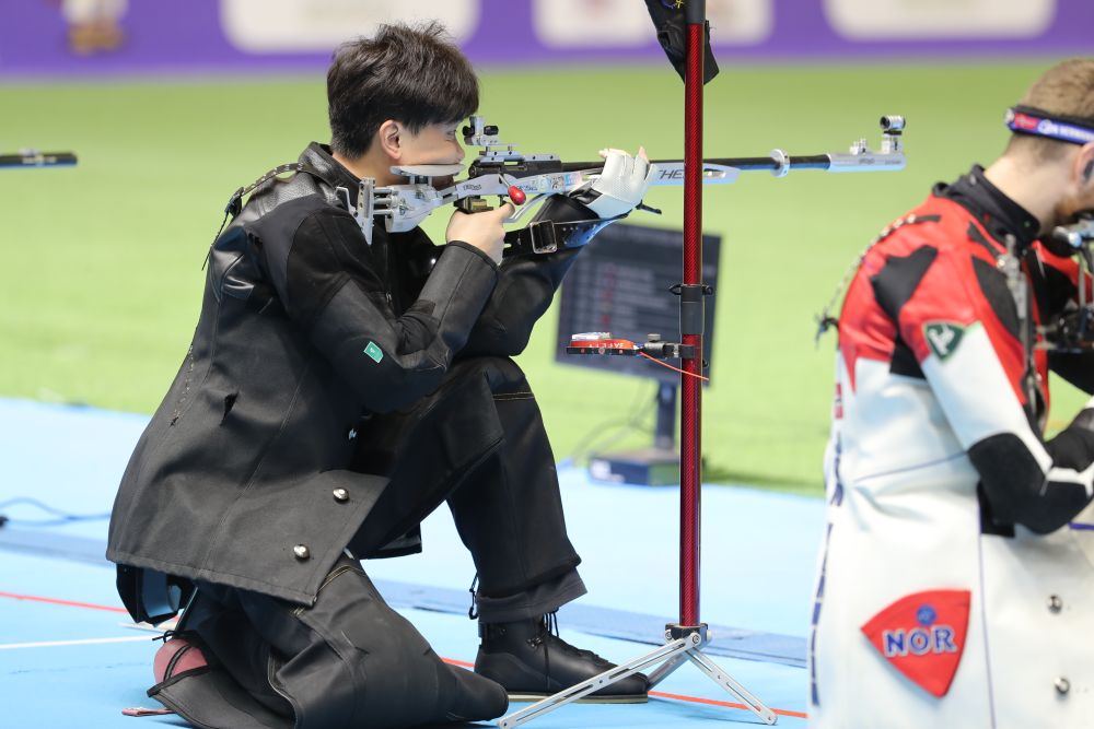 男子50米步枪三姿决赛的悬念持续到最后一枪。跪射和卧射结束后,奥运冠军刘宇坤比排名第二的印度新秀托马尔高出0.2环。此后,这位28岁的世界纪录保持者始终保持着微弱领先。倒数第二枪,刘宇坤打出9.7环,被托马尔反超0.1环。最后一枪,刘宇坤10.1环,而对手经过长时间犹豫打出9.8环,葬送良机。刘宇坤以0.2环的优势惊险夺冠,成绩为467.1环。这也是刘宇坤的第一个世锦赛冠军,他曾在2017年世锦赛中获得该项目青年组冠军。
