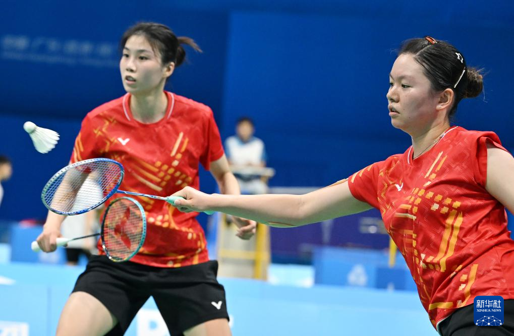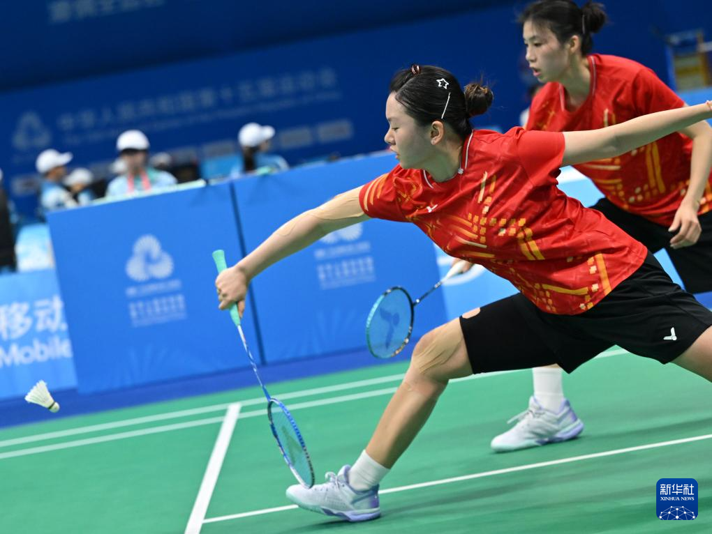 11月11日,江苏队组合夏玉婷(右)/郭雨欣在女双比赛中回球。她们2比0战胜浙江队组合陈樊淑湉/吴梦莹。