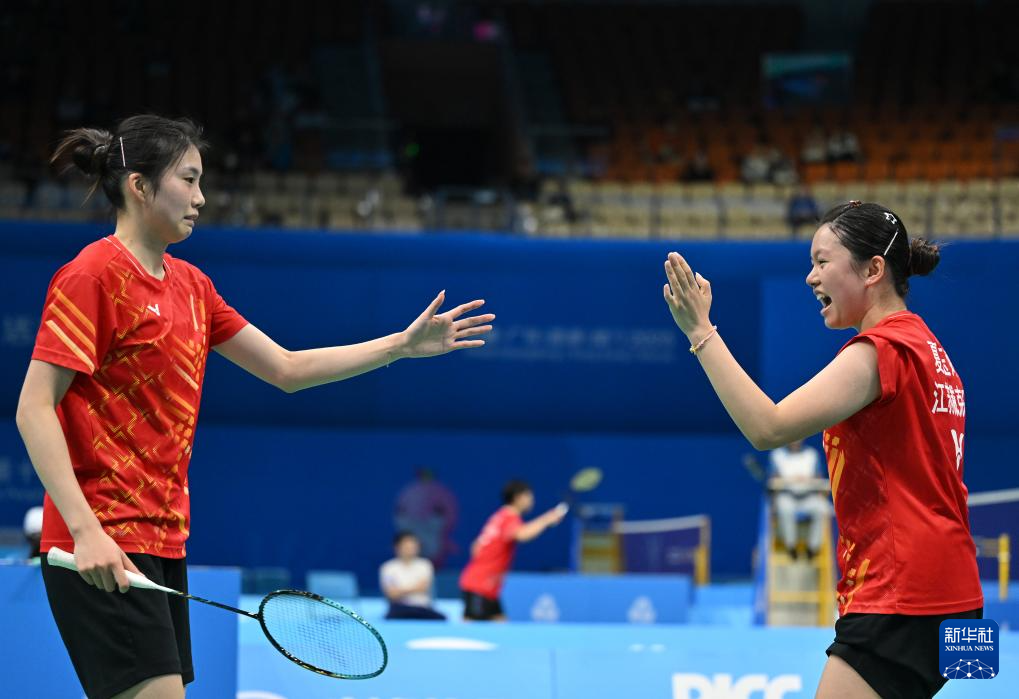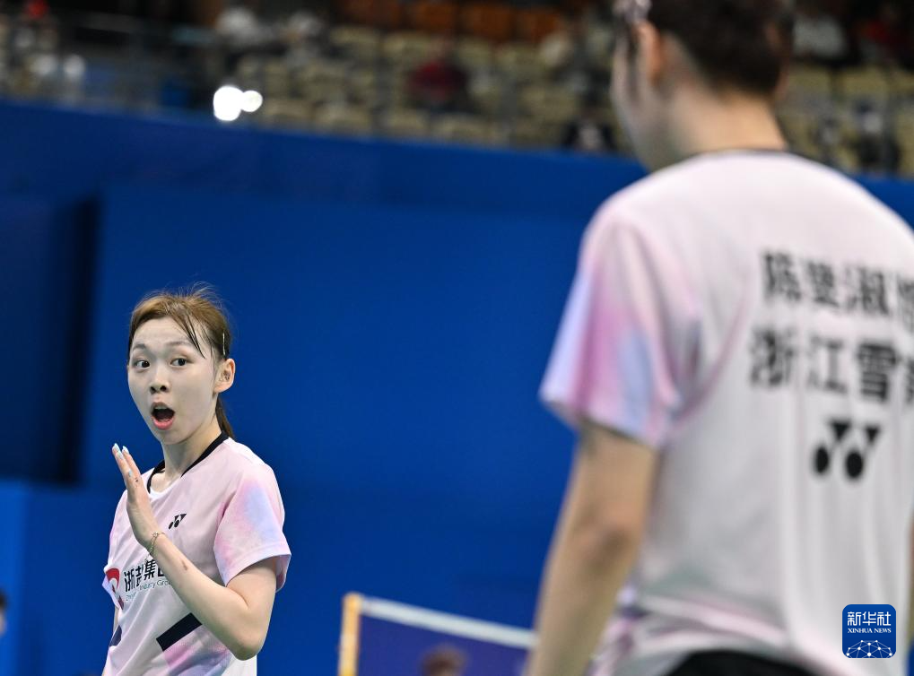 11月11日,江苏队组合夏玉婷(右)/郭雨欣在女双比赛中庆祝。她们2比0战胜浙江队组合陈樊淑湉/吴梦莹。